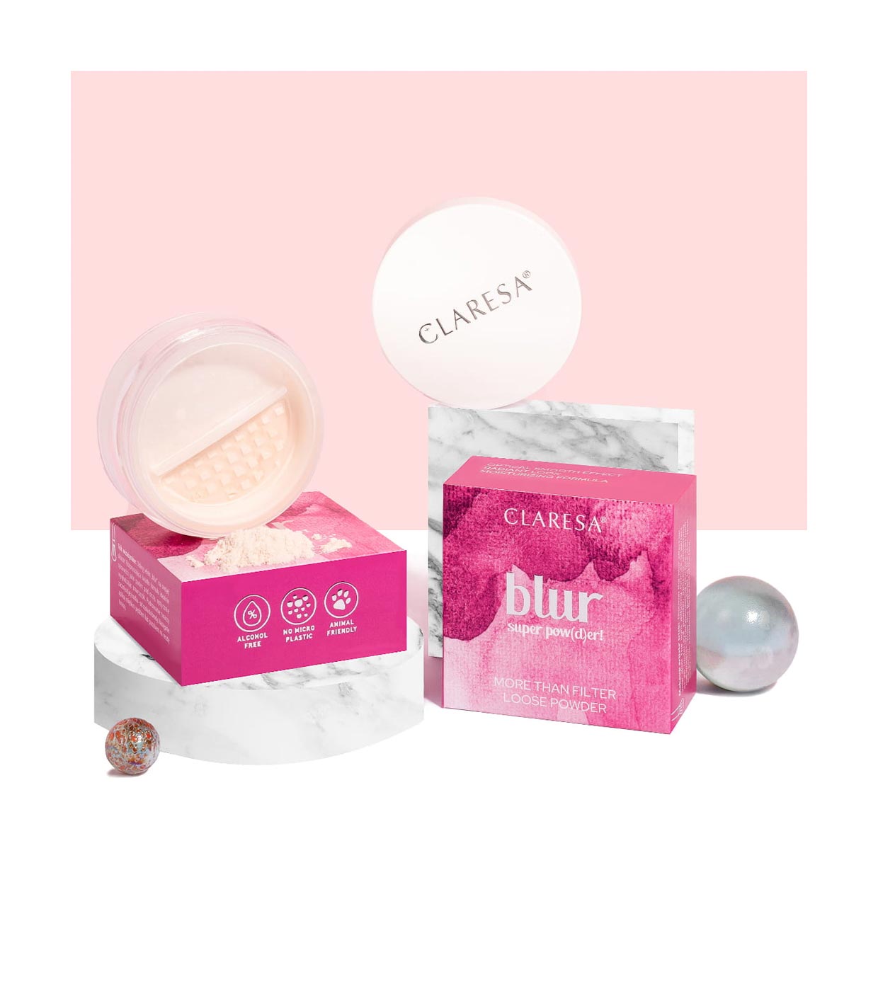 Der lose Puder Blur Super Pow(d)er! von Claresa sorgt für diesen fantastischen optischen Glättungseffekt von Poren und unerwünschten Mimikfalten.