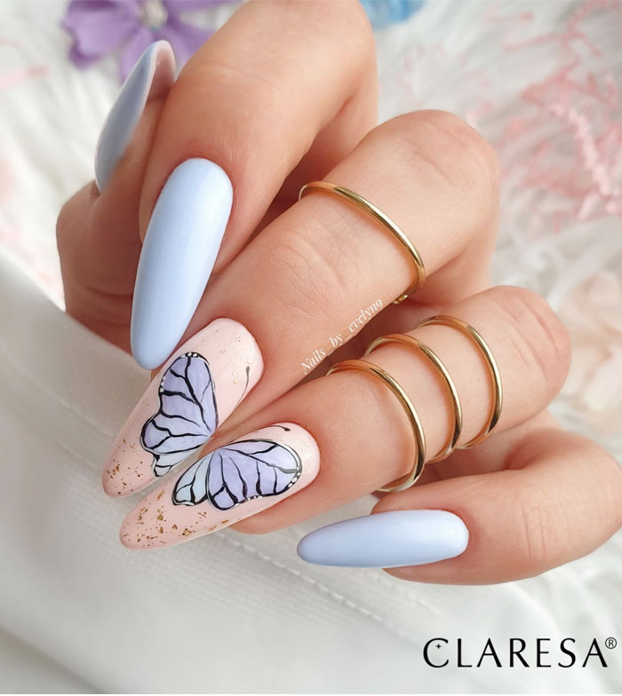 Auf die zuvor aufgetragene und ausgehärtete Claresa-Basis eine dünne Schicht semi-permanenten Nagellack auftragen und in einer UV-/LED-Lampe trocknen. Um einen perfekteren Effekt zu erzielen, können Sie die Aktivität wiederholen. Anschließend sollte der Decklack aufgetragen und erneut in der Lichtlampe ausgehärtet werden.