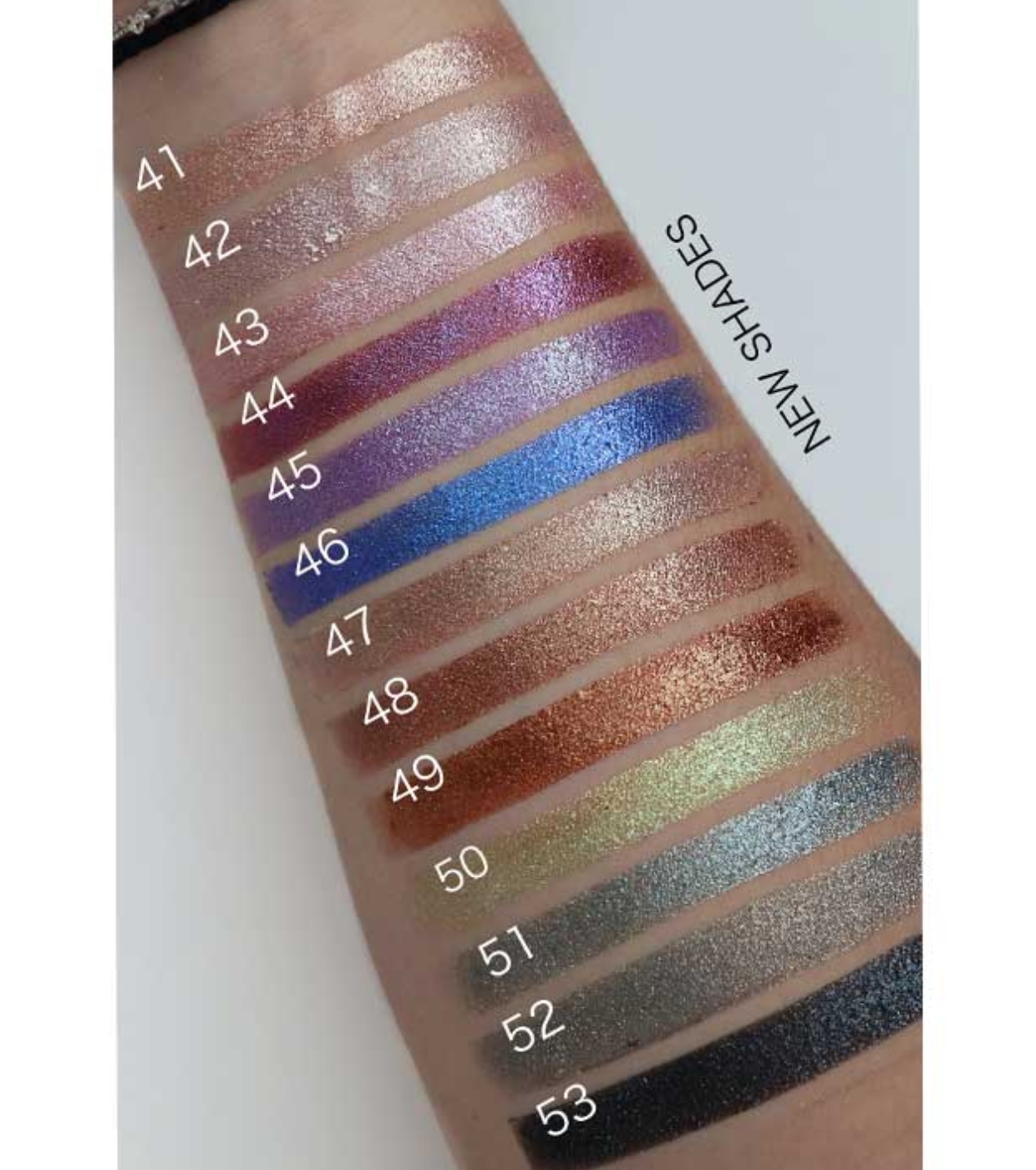 JULIAMe repito... brillo espectacular, tacto sedoso, buena cobertura. si te gustan los looks con brillos y muy luminosos estas sombras son las tuyas. Algunas son mas purpurinosas que otras pero todas preciosas