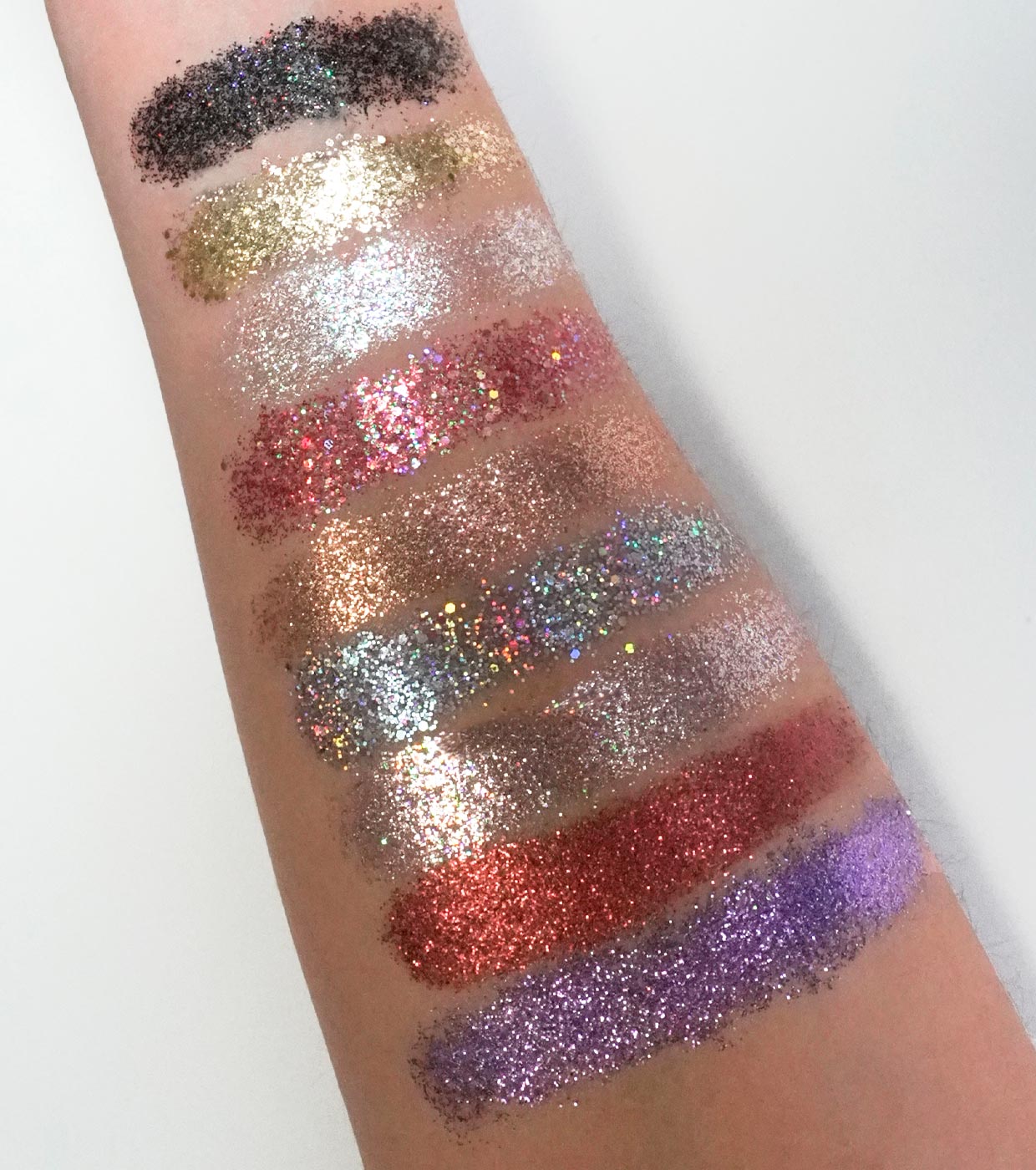 *Alle Farbtöne der Palette haben eine ölige Basis, die als Kleber und Fixierer fungiert und dafür sorgt, dass der Glitzer perfekt auf dem Augenlid haftet. Für zusätzlichen Halt ist jedoch der Magic Fix der Marke Ihr bester Verbündeter.