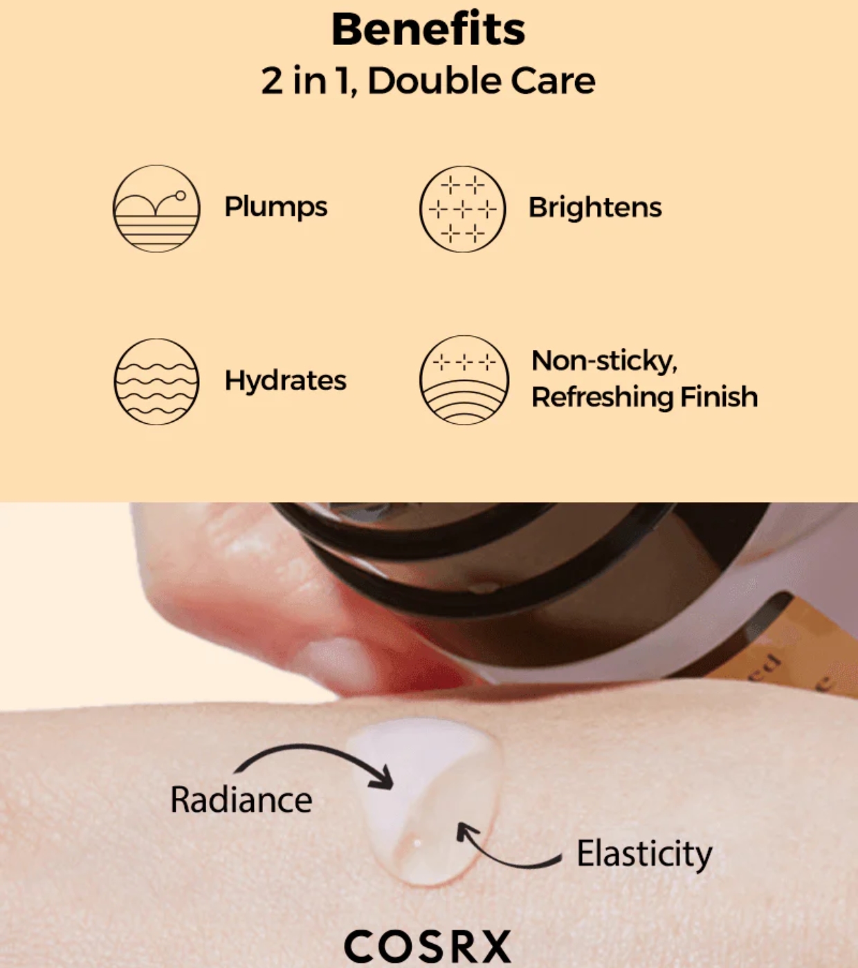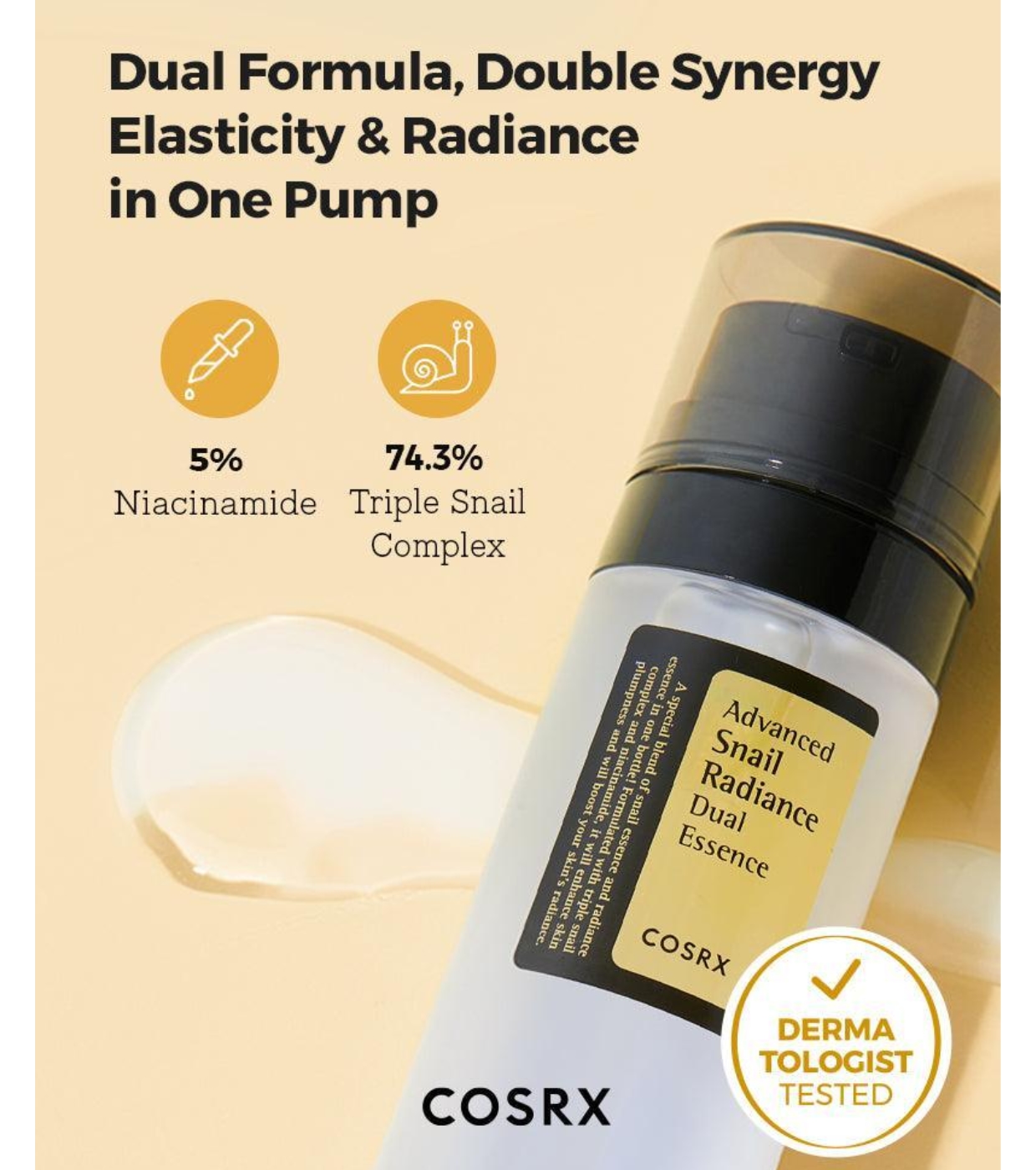 Verwandeln Sie Ihre Hautpflegeroutine mit dieser innovativen aufhellenden Essenz Advanced Snail Radiance Dual Essence von COSRX , die bei jeder Anwendung kraftvolle Schneckenessenz mit einer aufhellenden Essenz verbindet.