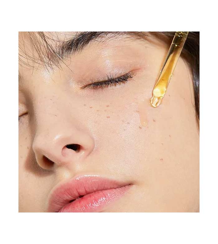 Schütteln Sie die Flasche ein- oder zweimal vorsichtig hin und her und tragen Sie ein paar Tropfen auf die gereinigte Haut auf. Dann das Serum sanft einmassieren, beginnend von der Innenseite des Gesichts.
