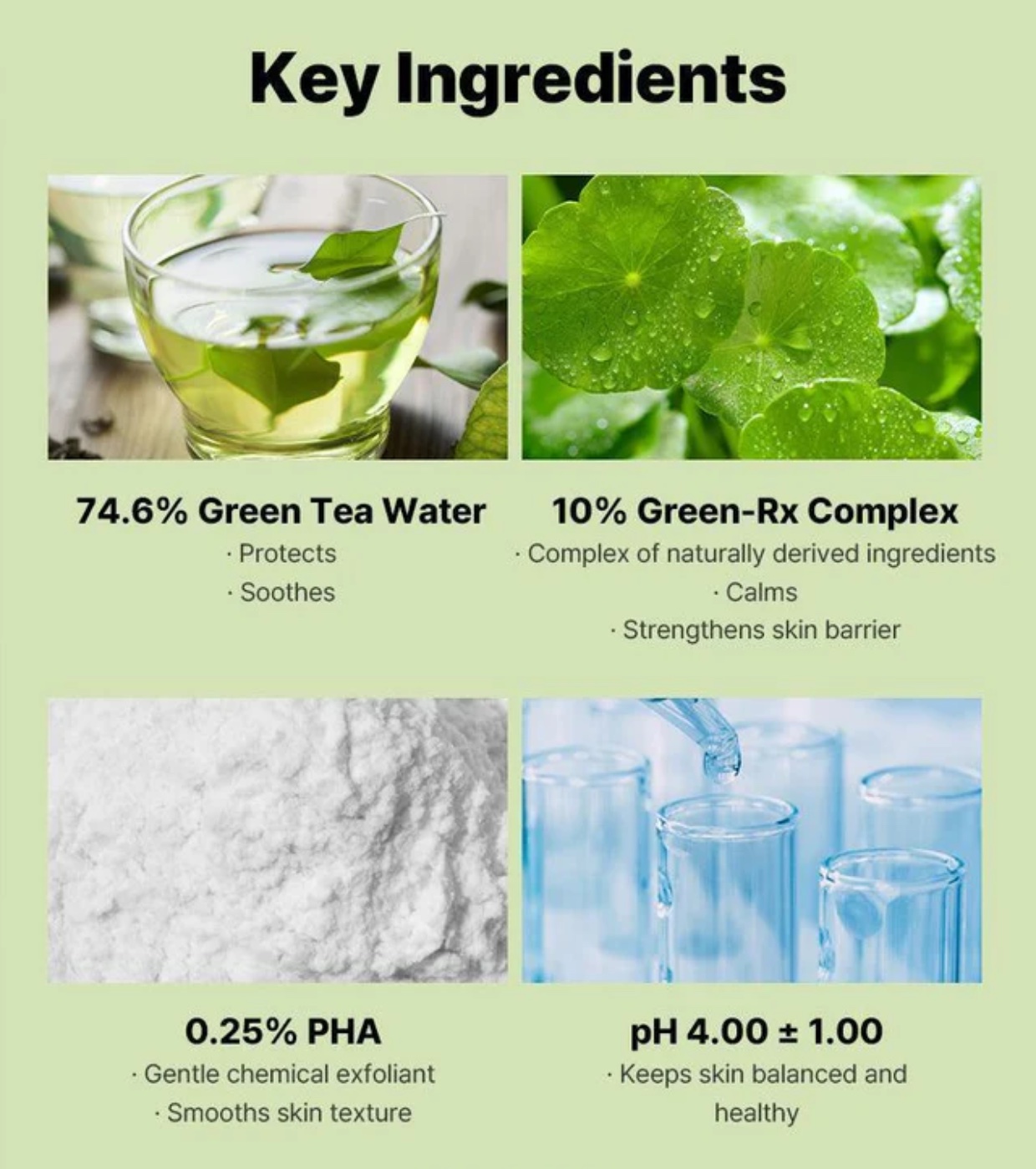 Der mit natürlichen Pflanzenextrakten formulierte Green-RX-Komplex dringt sanft in die Haut ein und hilft, sie zu regenerieren und zu beruhigen, wenn sie gereizt ist.
