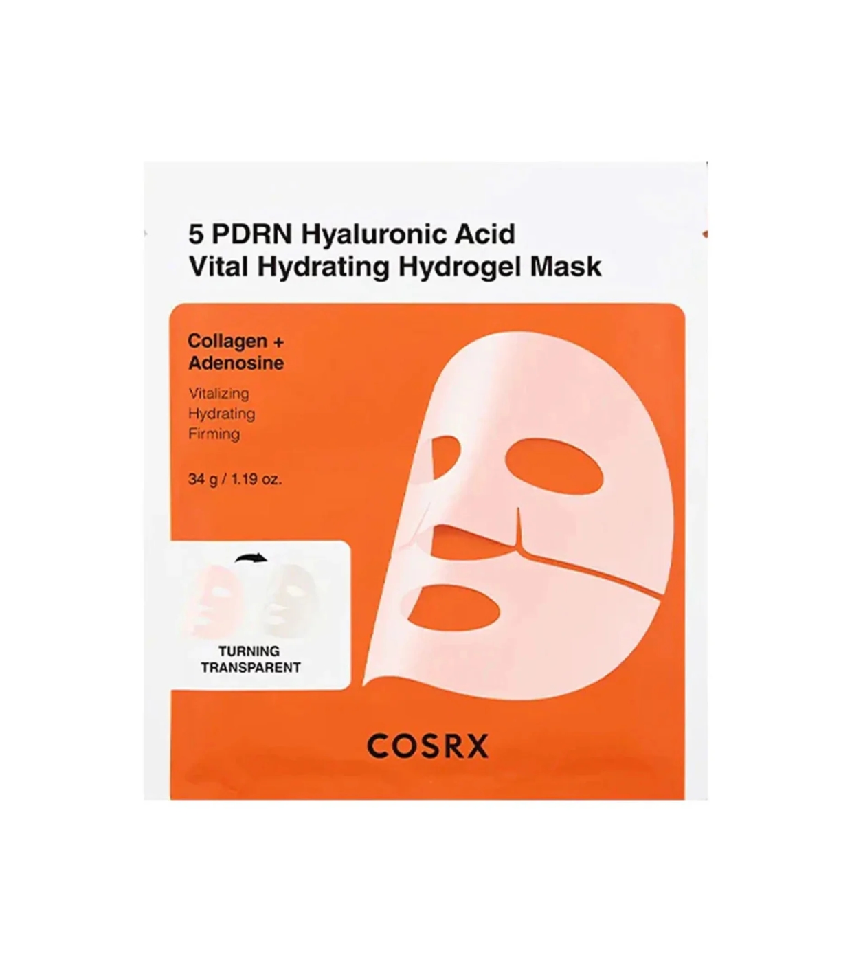 Die 5 PDRN Hyaluronic Acid Vital Maske von COSRX ist ein intensiv feuchtigkeitsspendendes Hydrogel, das sich wie eine zweite Schicht an die Haut anpasst und beim Freisetzen seiner Wirkstoffe transparent wird.