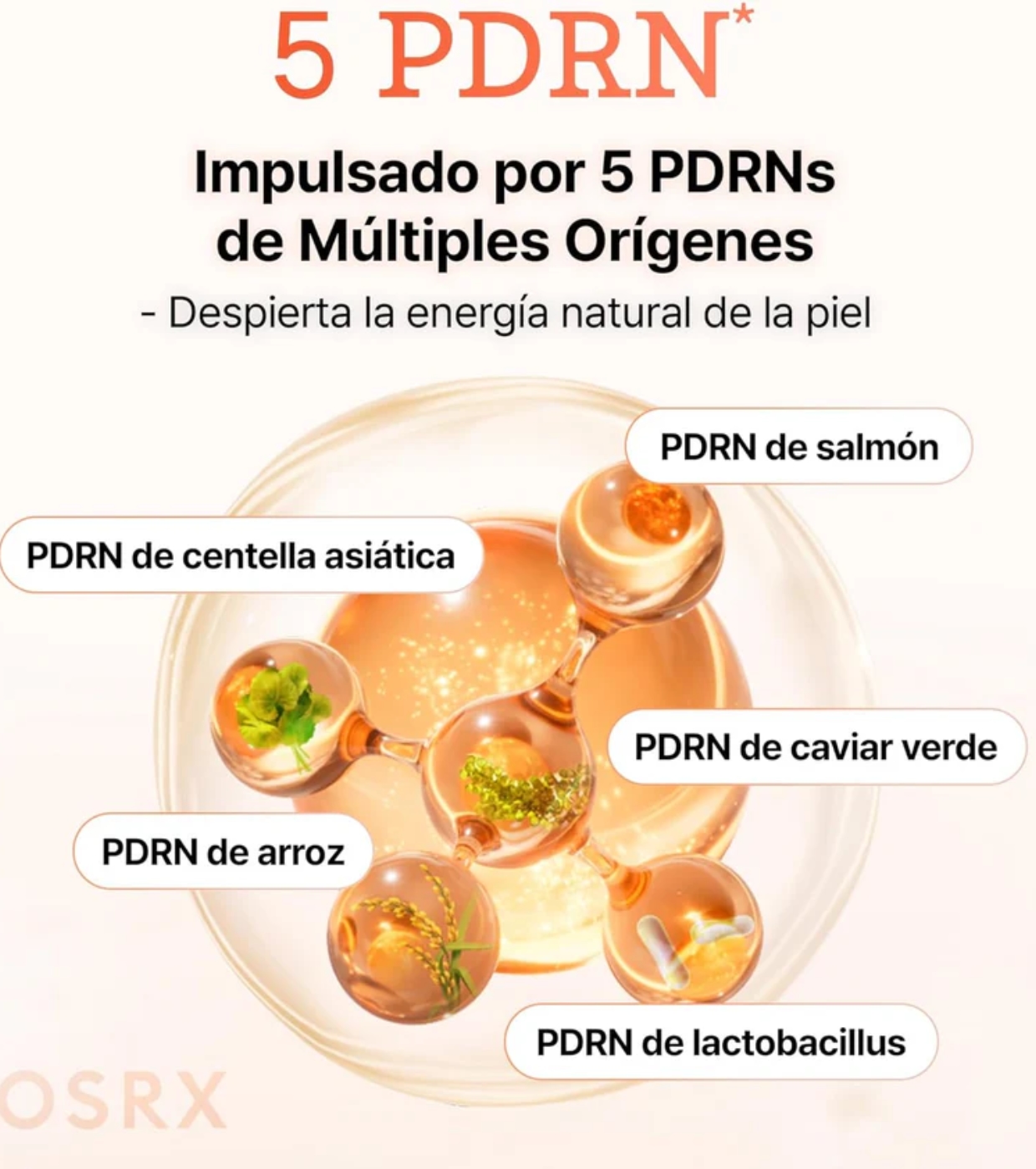 Es enthält 5 Arten von PDRN (Derivate aus Lachs, Centella asiatica, Reis, Lactobacillus und Meerestraube), die für ihre Fähigkeit bekannt sind, die Hautregeneration anzuregen, die Elastizität zu verbessern und die Zeichen der Hautalterung zu reduzieren.
