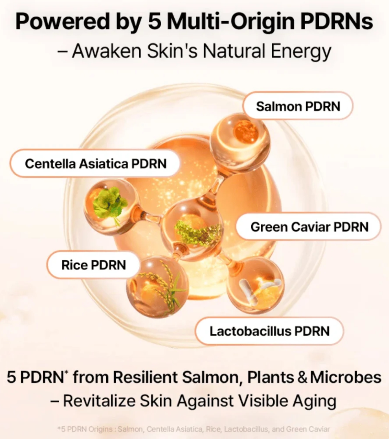 Es enthält fünf Arten von PDRN, die aus Lachs, Centella asiatica, Reis, Lactobacillus und Meerestrauben gewonnen werden und zusammenwirken, um die Haut zu revitalisieren, ihre Elastizität zu verbessern und sie gegen äußere Einflüsse zu stärken.