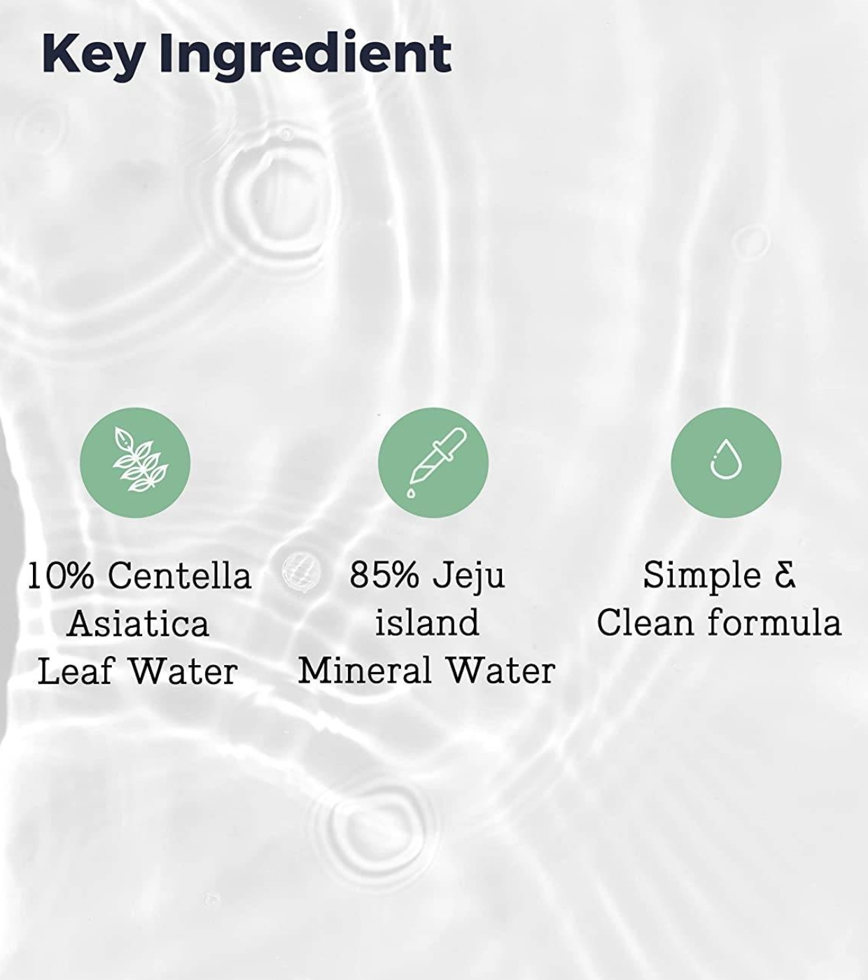 Seine Formel kombiniert Pflanzen- und Pflanzenextrakte mit 10 % Centella Asiatica-Blattextrakt und 82 % Mineralwasser von der Insel Jeju und bietet eine Mischung, die reich an Mineralien und Vitaminen ist, um geschwächte und stumpfe Haut zu verjüngen.