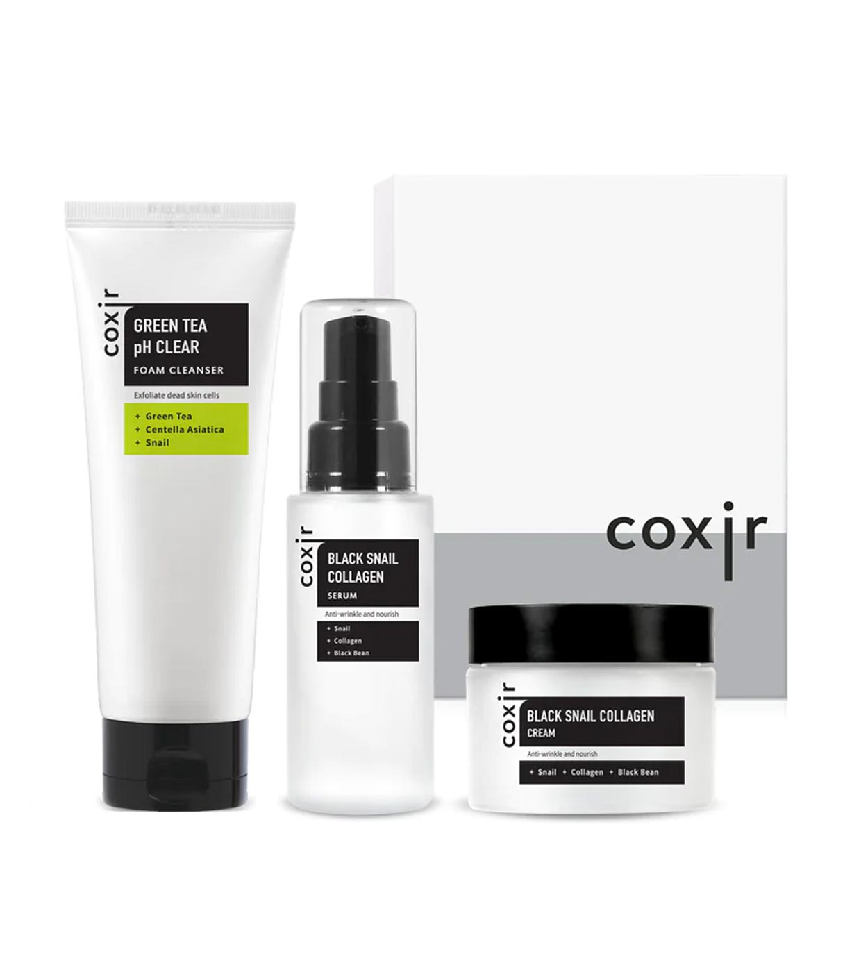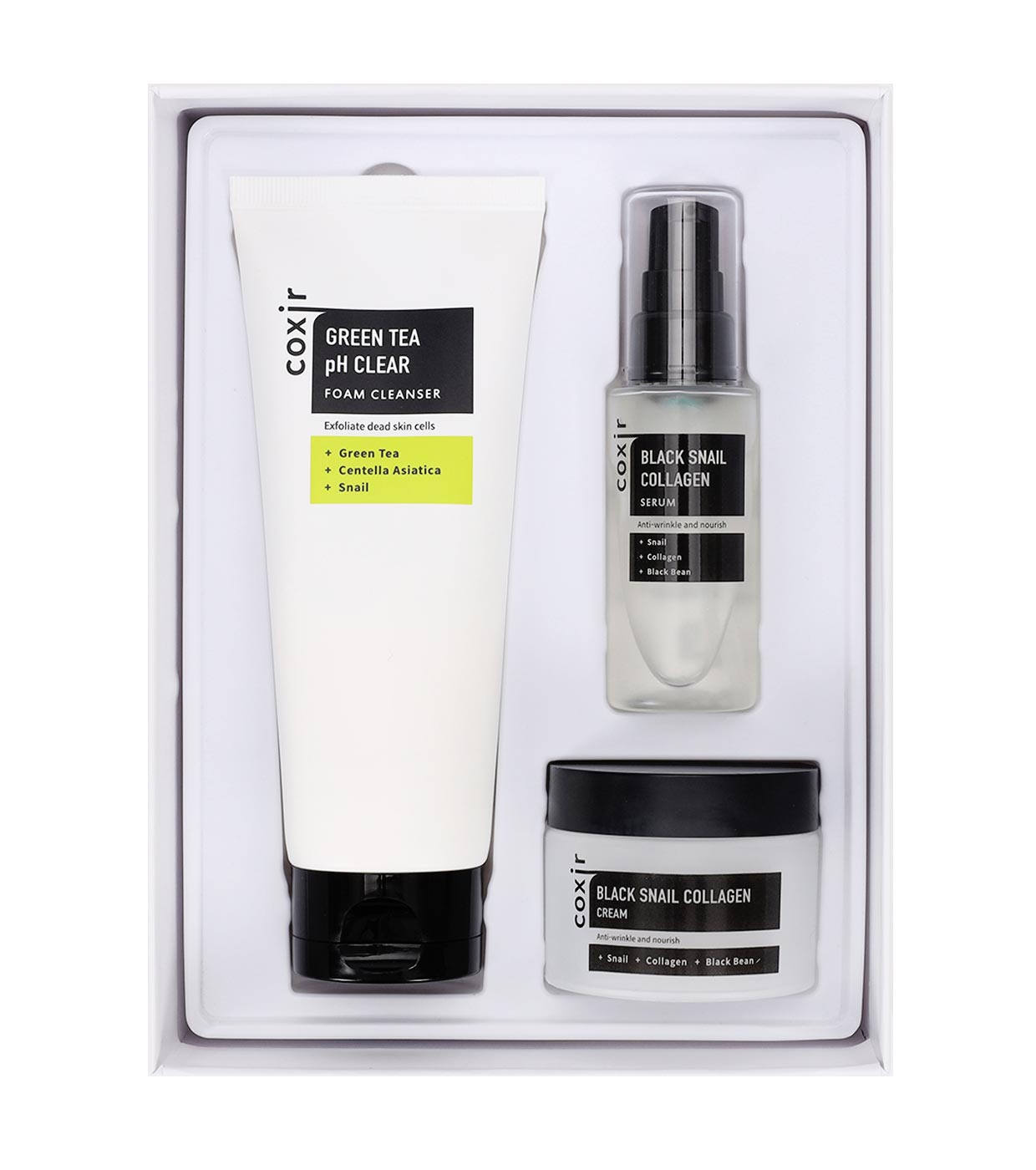 COXIR Black Snail Gift Set ist ein Set mit einem Reinigungsmittel, einem Serum und einer Creme, die Ihre Haut mit wohltuenden Wirkungen versorgt, da es gegen Hautunreinheiten und Falten wirkt, die Haut aufhellt, mit Feuchtigkeit versorgt, nährt und die Elastizität der Haut verbessert.