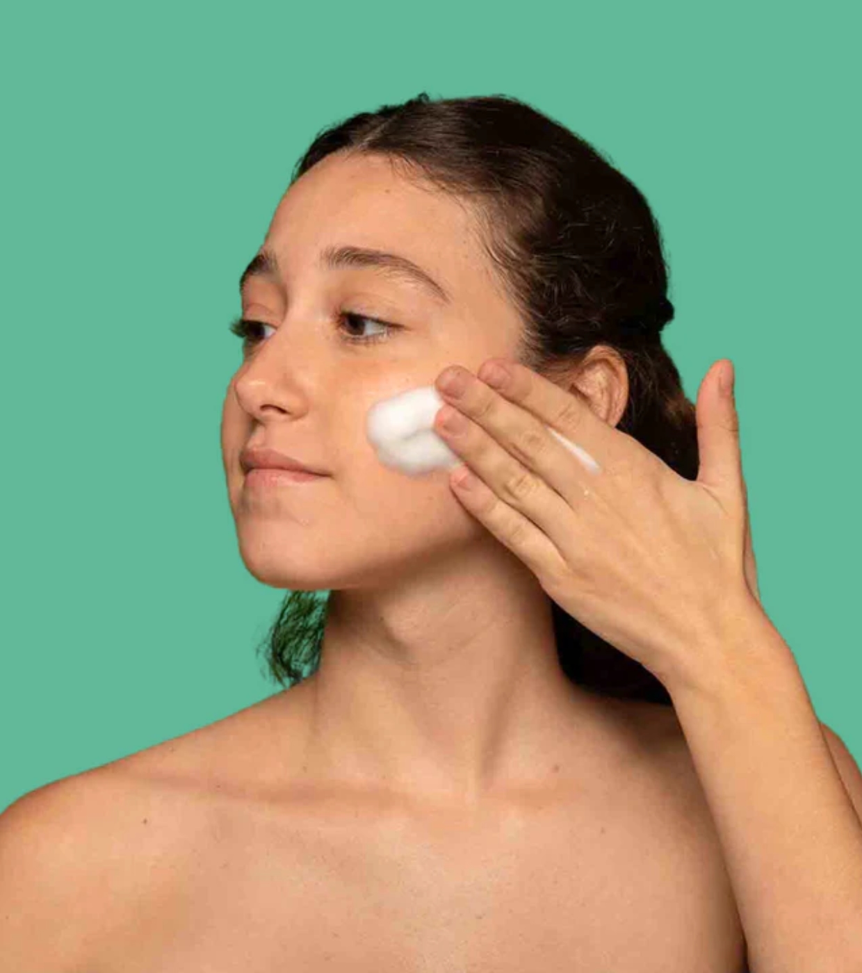 Tragen Sie den Schaum mit kreisenden Bewegungen auf Ihr Gesicht auf und achten Sie dabei besonders auf die T-Zone (Stirn, Nase und Kinn).