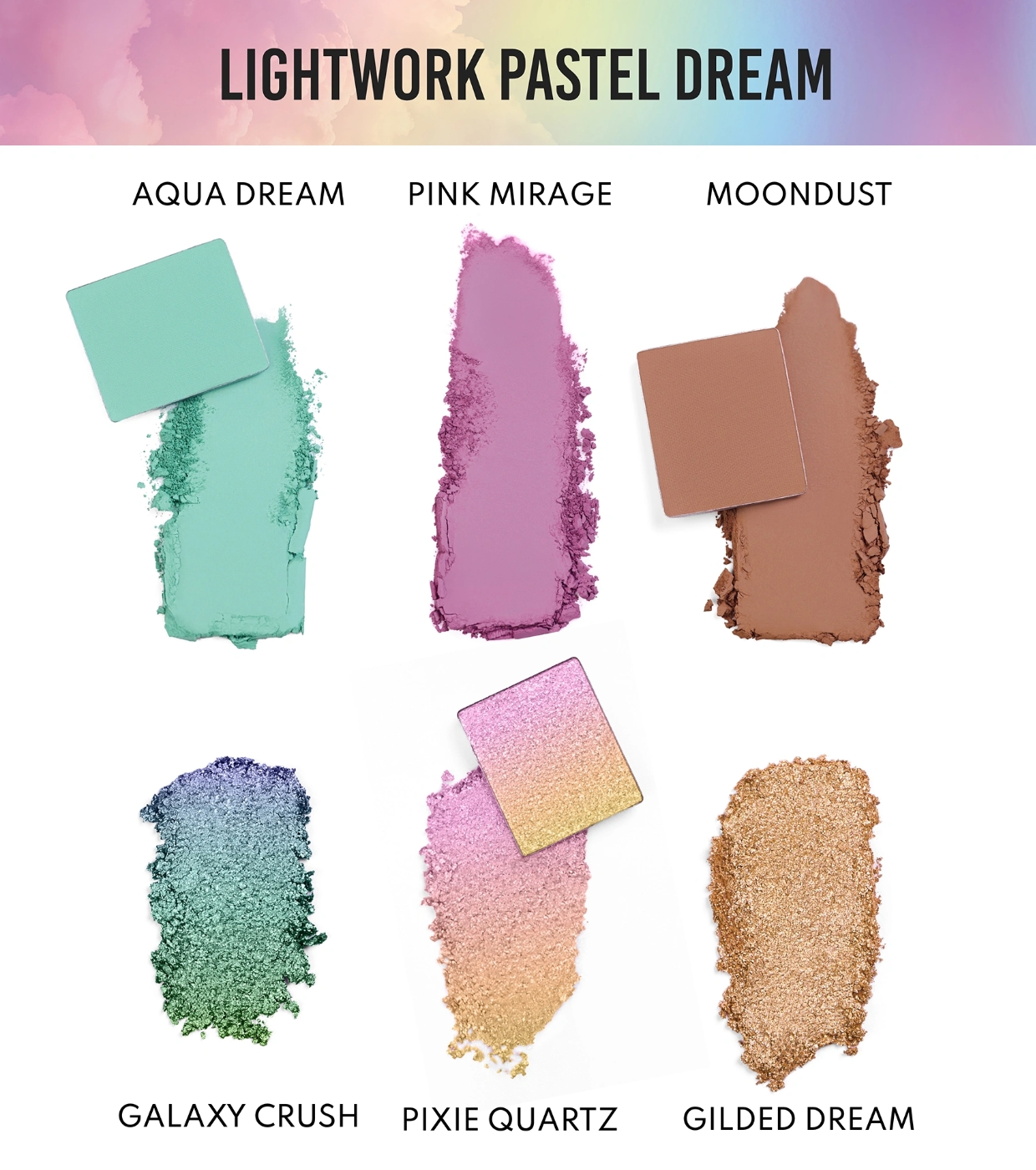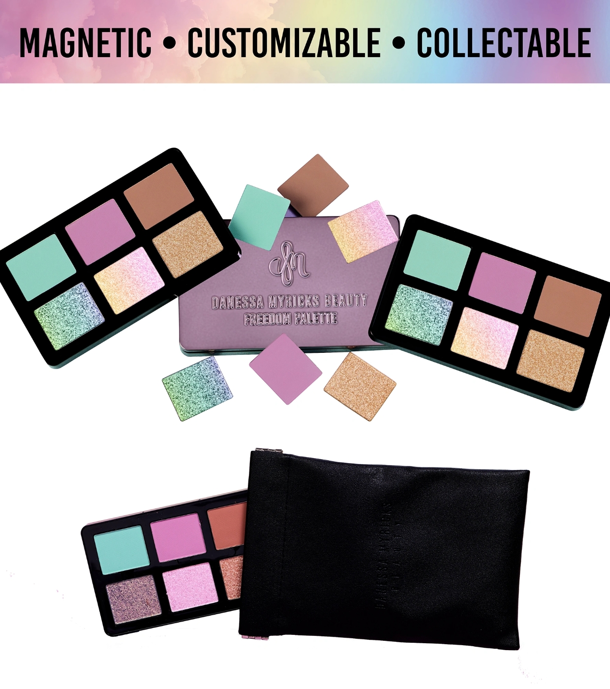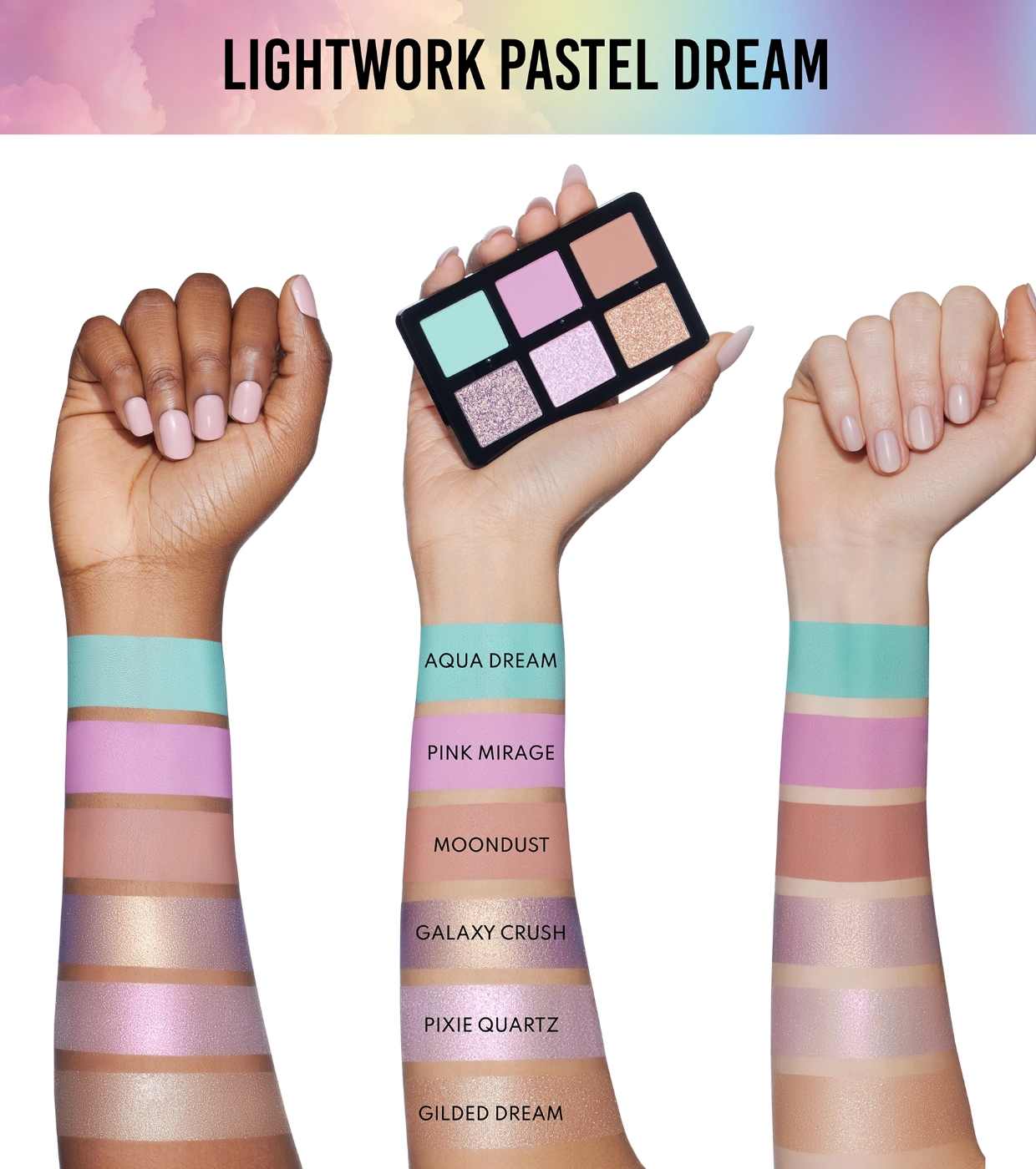 Entdecken Sie ein ätherisches Farberlebnis mit der Lidschattenpalette Pastel Dream von Danessa Myricks , einer magnetischen Minipalette mit 6 multichromatischen, weichen, matten Farbtönen, die vom magischen Licht der Wolken bei Sonnenuntergang inspiriert sind.