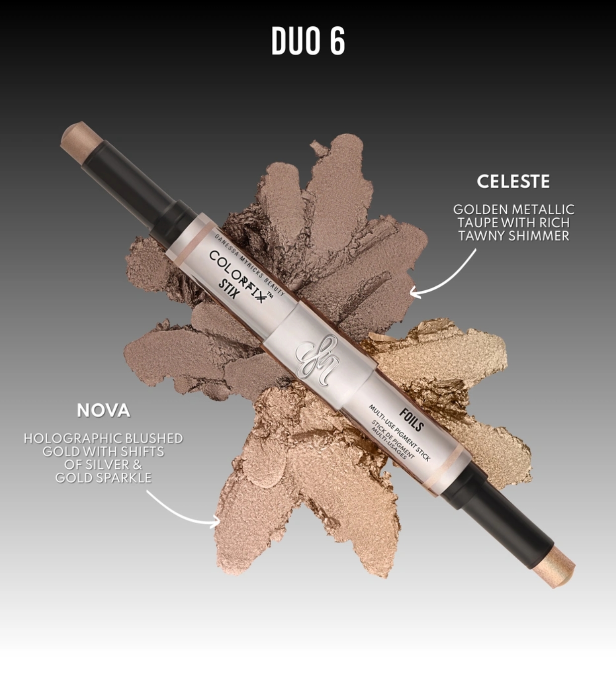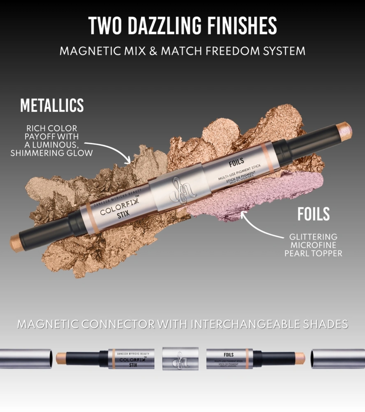 Entdecken Sie das Colorfix Stick Duo von Danessa Myricks mit perlmuttartiger Textur und erfrischendem Effekt bei Kontakt, perfekt zum Auftragen auf Augen, Wangen und Lippen.