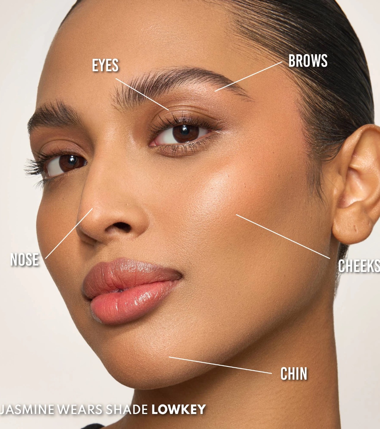 Eine neue Generation von getönten Puder-Highlighting-Balsamen, die das Licht reflektieren und die Haut verwandeln, verwischen und für einen sanften, beleuchteten Glanz im ganzen Gesicht sorgen.