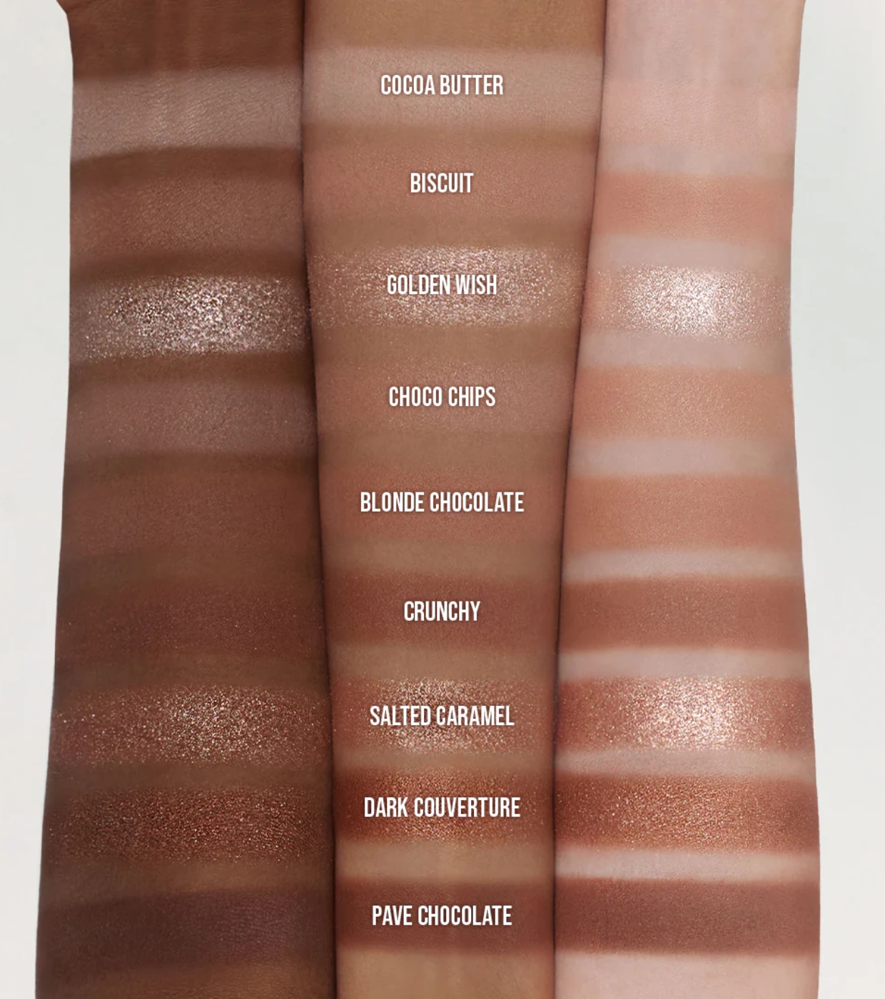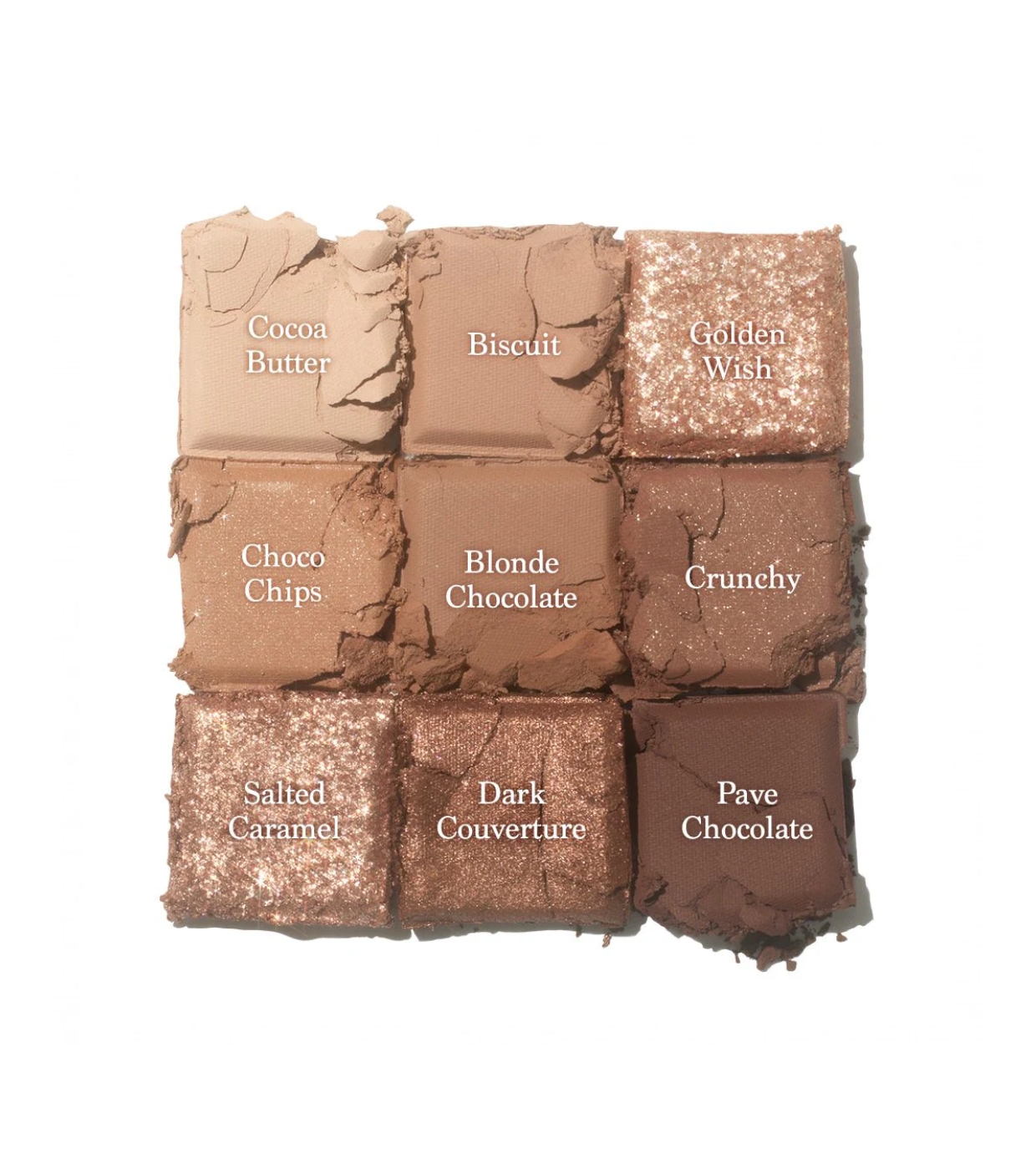 1 Cocoa Butter- Mica, Talc, Titanium Dioxide (CI 77891), Nylon-12, Octyldodecyl Stearoyl Stearate, Phenyl Trimethicone, Silica, Magnesium Myristate, Boron Nitride, Magnesium Stearate, Methylpropanediol, Dimethicone, Macadamia Ternifolia Seed Oil, Dimethicone/Vinyl Dimethicone Crosspolymer, Iron Oxides (CI 77492), Iron Oxides (CI 77491), Propanediol, Aluminum Hydroxide, Iron Oxides (CI 77499), Dimethiconol Stearate, Methicone, Hydrogenated Lecithin, Triethoxycaprylylsilane, Carmine (CI 75470), Yellow 5 Lake (CI 19140), Ultramarines (CI 77007), Maltodextrin 2 Biscuit- Talc, Mica, Caprylic/Capric Triglyceride, Boron Nitride, Nylon-12, Silica, Titanium Dioxide (CI 77891), Diisostearyl Malate, Magnesium Myristate, Iron Oxides (CI 77491), Iron Oxides (CI 77492), Magnesium Stearate, Ultramarines (CI 77007), Methylpropanediol, Macadamia Ternifolia Seed Oil, Dimethicone, Dimethicone/Vinyl Dimethicone Crosspolymer, Propanediol, Iron Oxides (CI 77499), Dimethiconol Stearate, Triethoxycaprylylsilane, Lauroyl Lysine, Manganese Violet (CI 77742), Aluminum Hydroxide, Methicone, Kaolin 3 Golden Wish- Bis-Diglyceryl Polyacyladipate-2, Calcium Aluminum Borosilicate, Polybutylene Terephthalate, Calcium Titanium Borosilicate, Titanium Dioxide (CI 77891), Polyglyceryl-2 Triisostearate, Mica, Polyethylene Terephthalate, Silica, Calcium Sodium Borosilicate, Acrylates Copolymer, Ethylene/VA Copolymer, Iron Oxides (CI 77491), Methylpropanediol, Dimethicone, Propanediol, Tin Oxide, Triethoxycaprylylsilane, Carmine (CI 75470) 4 Choco Chips- Mica, Talc, Calcium Sodium Borosilicate, Titanium Dioxide (CI 77891), Nylon-12, Silica, Magnesium Myristate, Neopentyl Glycol Diethylhexanoate, Phenyl Trimethicone, Iron Oxides (CI 77491), Iron Oxides (CI 77492), Dipentaerythrityl Hexahydroxystearate/Hexastearate/Hexarosinate, Dimethicone, Magnesium Stearate, Methylpropanediol, Octyldodecyl Stearoyl Stearate, Isostearyl Neopentanoate, Diisostearyl Malate, Macadamia Ternifolia Seed Oil, Iron Oxides (CI 77499), Dimethicone/Vinyl Dimethicone Crosspolymer, Propanediol, Polybutene, Yellow 5 Lake (CI 19140), Lauroyl Lysine, Triethoxycaprylylsilane, Hydrogenated Lecithin, Carmine (CI 75470), Aluminum Hydroxide, Methicone, Tin Oxide, Maltodextrin 5 Blonde Chocolate- Talc, Mica, Titanium Dioxide (CI 77891), Nylon-12, Iron Oxides (CI 77491), Octyldodecyl Stearoyl Stearate, Phenyl Trimethicone, Silica, Boron Nitride, Magnesium Myristate, Iron Oxides (CI 77492), Iron Oxides (CI 77499), Magnesium Stearate, Methylpropanediol, Macadamia Ternifolia Seed Oil, Dimethicone, Propanediol, Dimethicone/Vinyl Dimethicone Crosspolymer, Dimethiconol Stearate, Yellow 5 Lake (CI 19140), Lauroyl Lysine, Hydrogenated Lecithin, Triethoxycaprylylsilane, Aluminum Hydroxide, Methicone, Carmine (CI 75470), Maltodextrin 6 Crunchy- Talc, Mica, Iron Oxides (CI 77491), Silica, Nylon-12, Calcium Sodium Borosilicate, Octyldodecyl Stearoyl Stearate, Phenyl Trimethicone, Iron Oxides (CI 77499), Magnesium Myristate, Iron Oxides (CI 77492), Ultramarines (CI 77007), Dipentaerythrityl Hexahydroxystearate/Hexastearate/Hexarosinate, Diisostearyl Malate, Macadamia Ternifolia Seed Oil, Methylpropanediol, Titanium Dioxide (CI 77891), Carmine (CI 75470), Dimethicone, Dimethicone/Vinyl Dimethicone Crosspolymer, Magnesium Stearate, Propanediol, Dimethiconol Stearate, Hydrogenated Lecithin, Lauroyl Lysine, Triethoxycaprylylsilane, Tin Oxide, Maltodextrin 7 Salted Caramel- Bis-Diglyceryl Polyacyladipate-2, Calcium Titanium Borosilicate, Polyethylene Terephthalate, Polybutylene Terephthalate, Calcium Aluminum Borosilicate, Calcium Sodium Borosilicate, Polyglyceryl-2 Triisostearate, Acrylates Copolymer, Titanium Dioxide (CI 77891), Ethylene/VA Copolymer, Mica, Iron Oxides (CI 77491), Magnesium Stearate, Methylpropanediol, Synthetic Fluorphlogopite, Dimethicone, Propanediol, Tin Oxide (CI 77861) 8 Dark Couverture- Calcium Titanium Borosilicate, Synthetic Fluorphlogopite, Talc, Iron Oxides (CI 77491), Mica, Octyldodecyl Stearoyl Stearate, Phenyl Trimethicone, Titanium Dioxide (CI 77891), Nylon-12, Magnesium Myristate, Iron Oxides (CI 77499), Dipentaerythrityl Tetrahydroxystearate/Tetraisostearate, Diisostearyl Malate, Magnesium Stearate, Methylpropanediol, Polyglyceryl-3 Diisostearate, Dimethicone, Polybutene, Silica, Propanediol, Shorea Robusta Seed Butter, Carmine (CI 75470), Iron Oxides (CI 77492), Yellow 5 Lake (CI 19140), Triethoxycaprylylsilane, Tin Oxide, Maltodextrin 9 Pave Chocolate- Talc, Mica, Iron Oxides (CI 77491), Iron Oxides (CI 77499), Nylon-12, Silica, Octyldodecyl Stearoyl Stearate, Phenyl Trimethicone, Iron Oxides (CI 77492), Boron Nitride, Magnesium Myristate, Carmine (CI 75470), Manganese Violet (CI 77742), Magnesium Stearate, Methylpropanediol, Titanium Dioxide (CI 77891), Macadamia Ternifolia Seed Oil, Dimethicone, Dimethicone/Vinyl Dimethicone Crosspolymer, Propanediol, Dimethiconol Stearate, Lauroyl Lysine, Triethoxycaprylylsilane, Hydrogenated Lecithin, Maltodextrin, Kaolin, Aluminum Hydroxide, Methicone