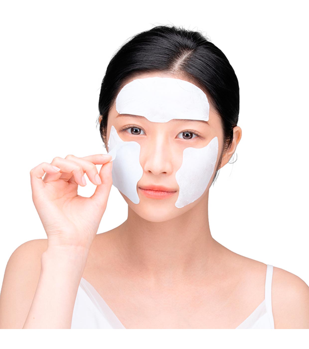 3.- Legen Sie das Pflaster mit der weißen Seite nach unten auf Ihr Gesicht. Drücken Sie, um auf der Haut zu haften und sich von der anderen Schicht zu trennen.