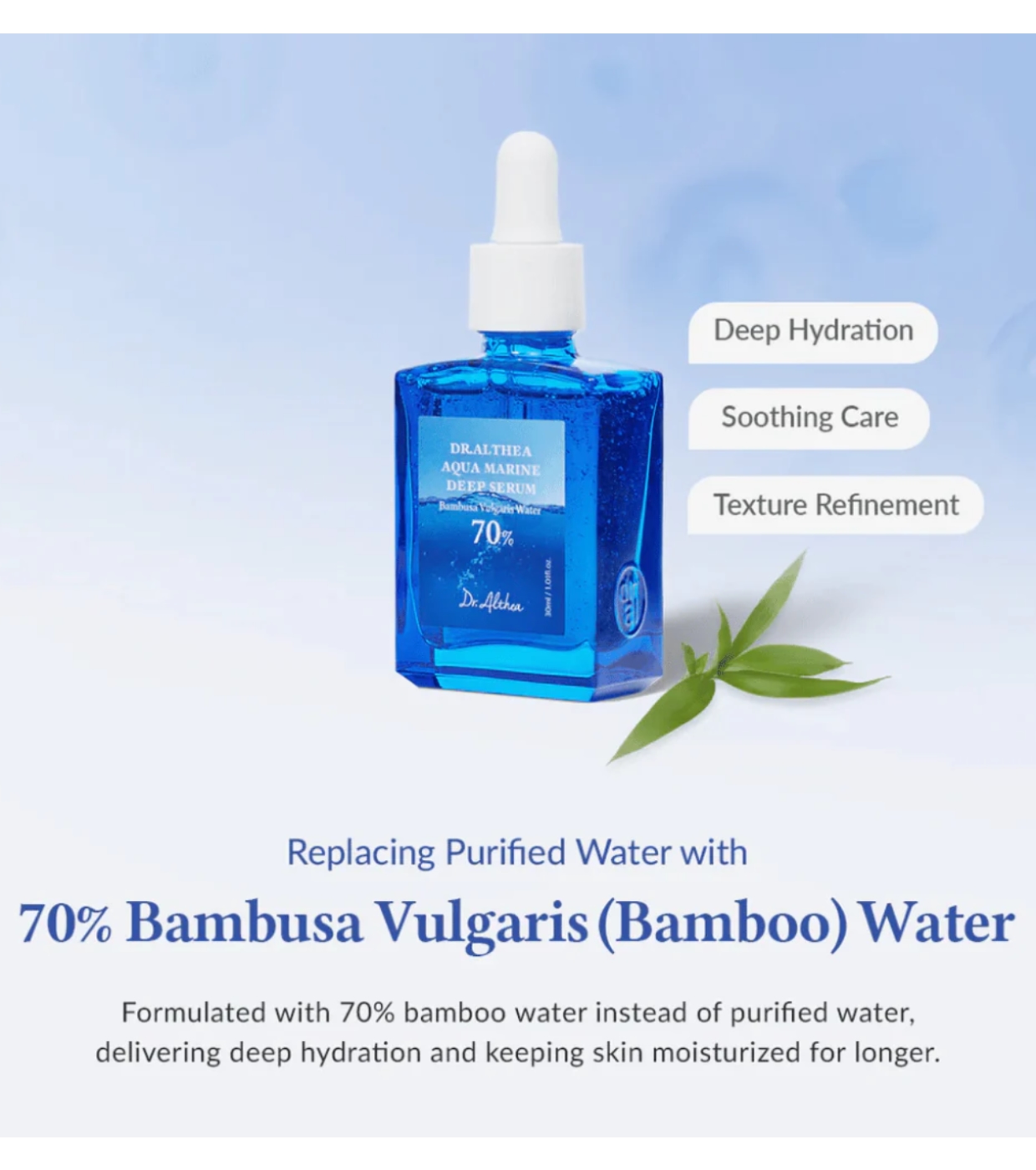 Die Formel enthält 70% Bambuswasser (Bambusa Vulgaris), das für seine hohe feuchtigkeitsspendende Wirkung bekannt ist und dazu beiträgt, die Haut zu beruhigen und zu erfrischen.