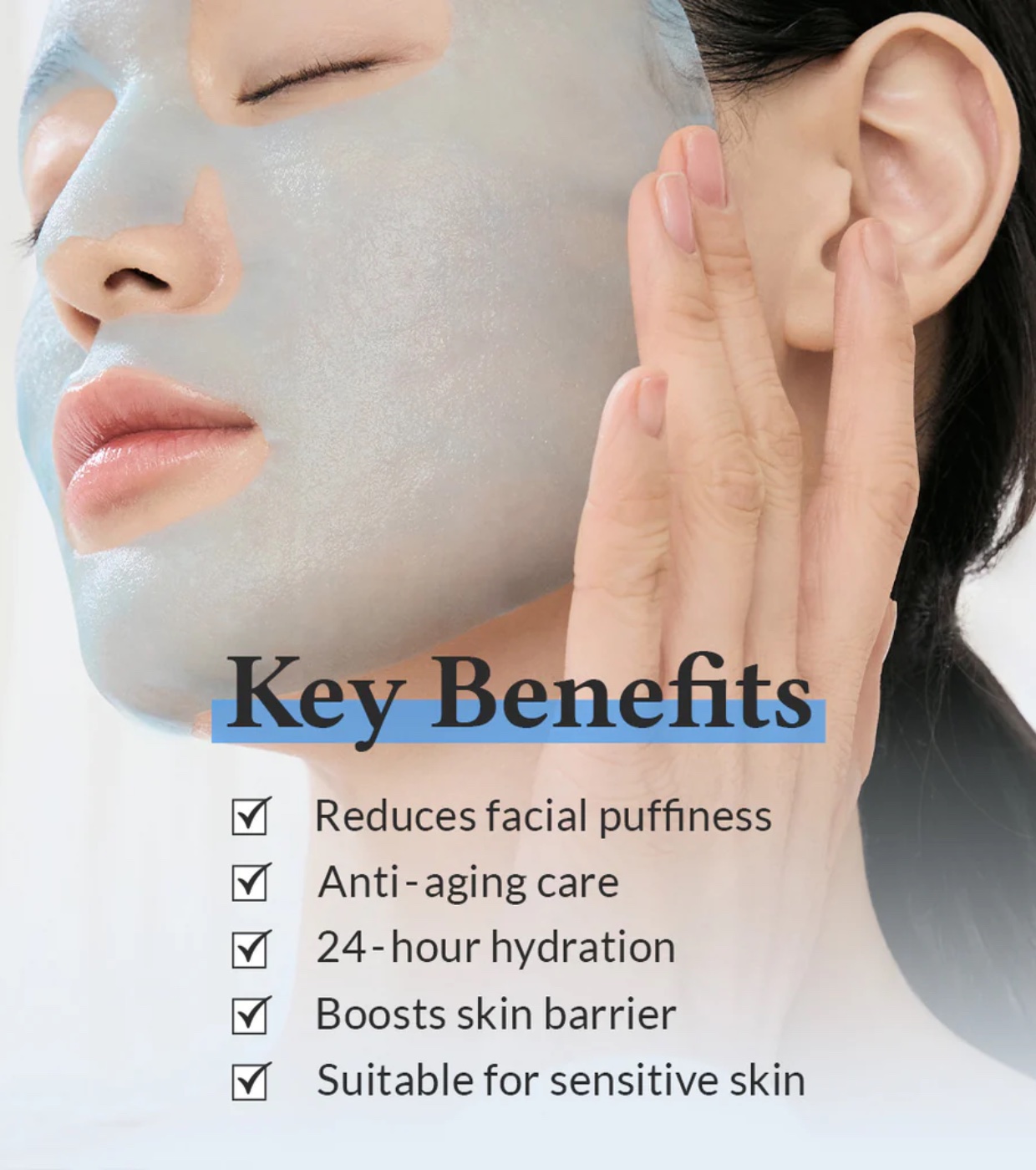 Der Schwerpunkt dieser Tuchmaske liegt auf der 24-Stunden-Feuchtigkeitsversorgung und der Beruhigung empfindlicher Haut.