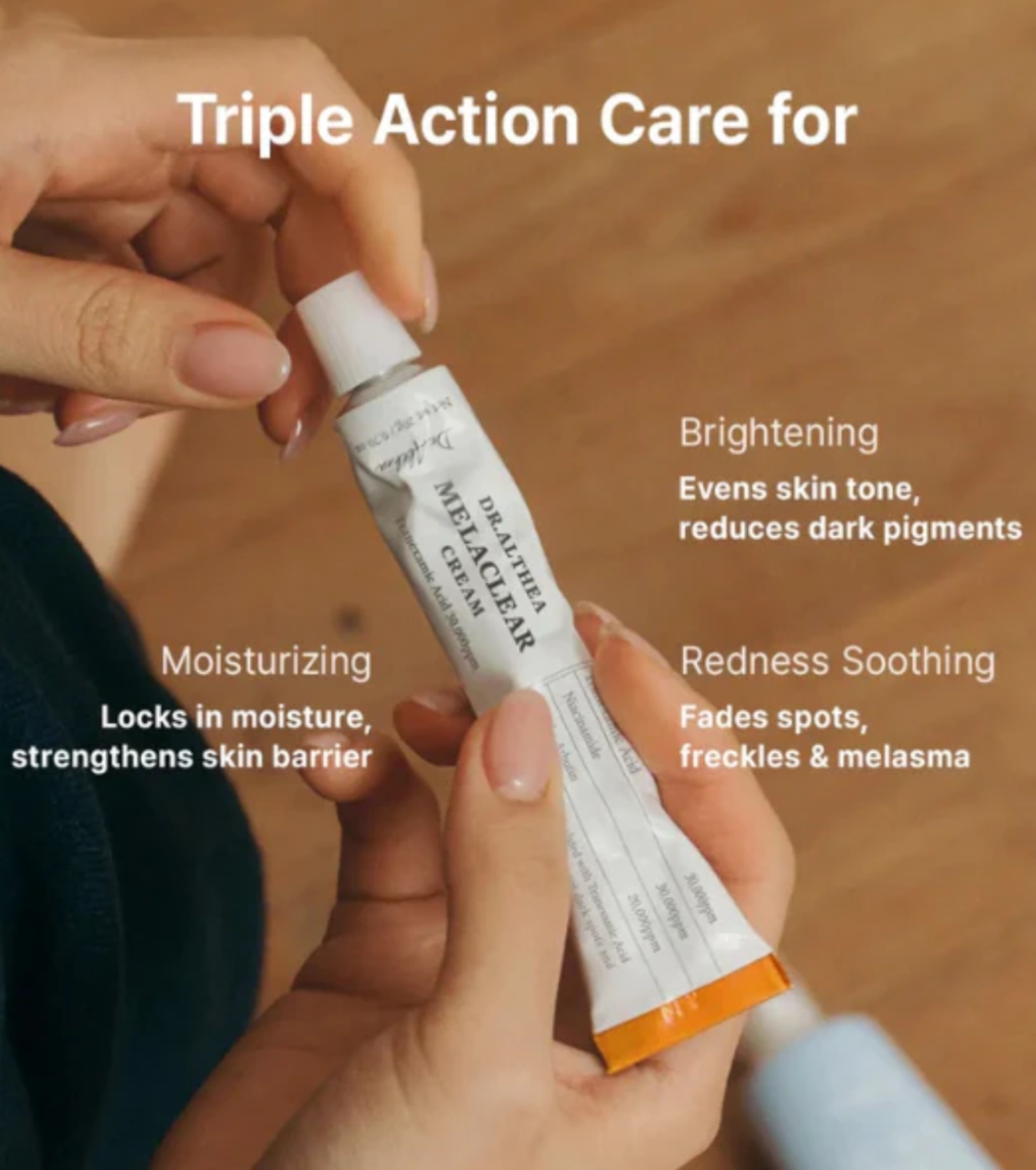 Die Formel kombiniert ein leistungsstarkes Dreifach-Anti-Melanin-System, das direkt auf überschüssige Pigmentierung einwirkt und gleichzeitig die Haut mit Feuchtigkeit versorgt und beruhigt.
