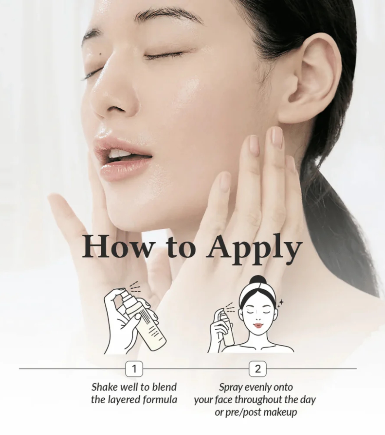 Einfach schütteln, um beide Schichten zu vermischen, und den leichten Nebel auf das Gesicht sprühen, um ein sofort erfrischendes, angenehmes und strahlendes Gefühl zu genießen.