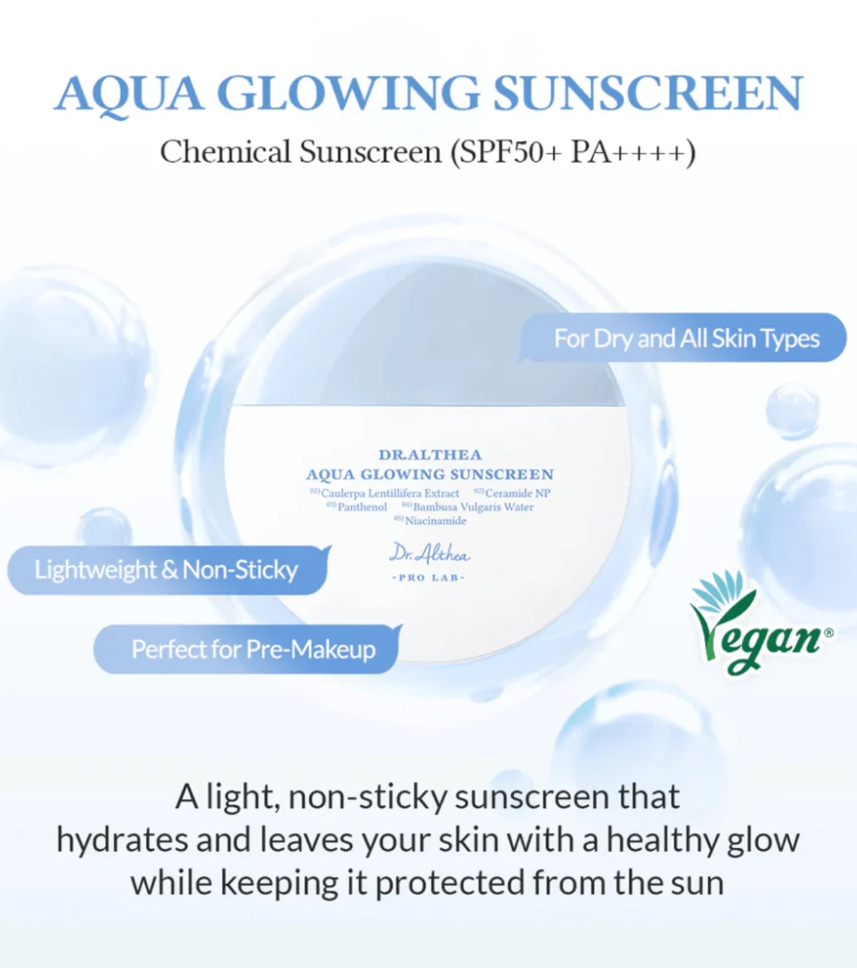Aqua Glowing Sunscreen SPF50+ PA++++ ist ein ultraleichtes koreanisches Sonnenschutzmittel, das einen hohen Breitbandschutz gegen UVA- und UVB-Strahlen bietet, gleichzeitig Feuchtigkeit spendet und der Haut ein strahlendes und natürliches Finish verleiht.