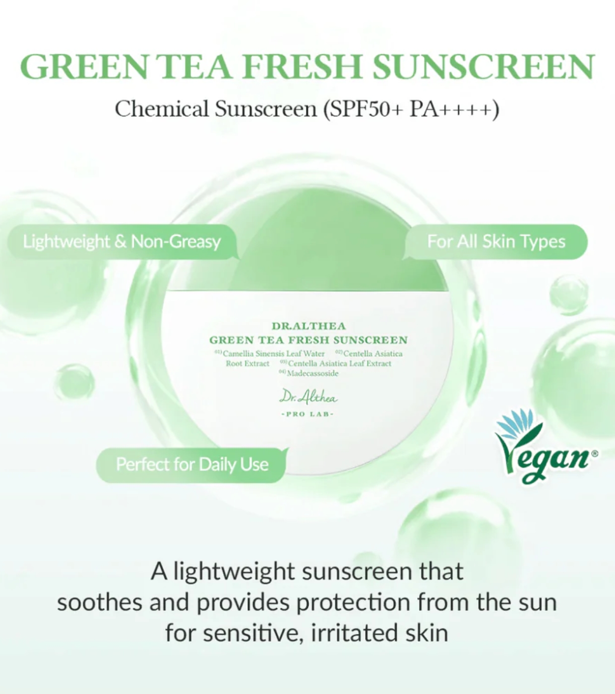 Dr. Altheas Green Tea Fresh Sunscreen ist ein leichtes und erfrischendes Sonnenschutzmittel mit LSF 50+ PA++++, das wirksamen Schutz vor den schädlichen Sonnenstrahlen bietet und gleichzeitig die Haut beruhigt und ausgleicht.