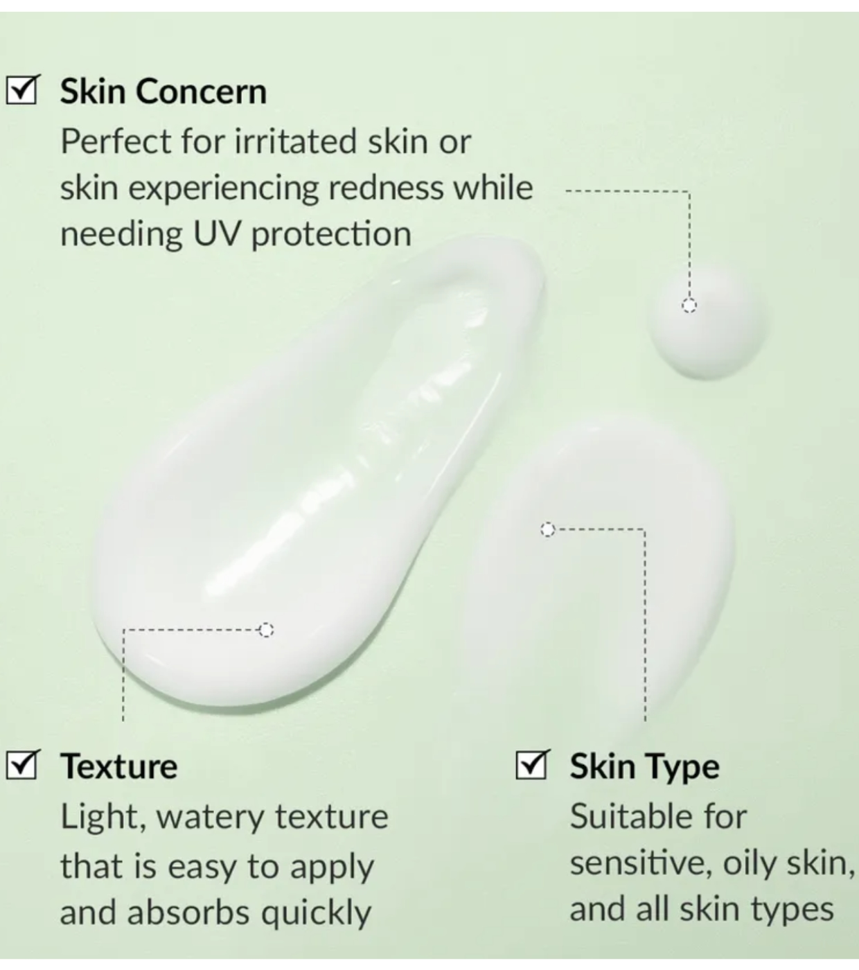 Water, Propanediol, Camellia Sinensis Leaf Water, Dibutyl Adipate, Ethylhexyl Triazone, Polymethylsilsesquioxane, Diisopropyl Sebacate, Butyloctyl Salicylate, Diethylamino Hydroxybenzoyl Hexyl Benzoate, Niacinamide, Drometrizole Trisiloxane, Methylene Bis-Benzotriazolyl Tetramethylbutylphenol, Caprylyl Methicone, Butylene Glycol, 1,2-Hexanediol, Pentylene Glycol, Behenyl Alcohol, Polyglyceryl-3 Methylglucose Distearate, Polyglyceryl-6 Distearate, Decyl Glucoside, Tromethamine, Candelilla/Jojoba/Rice Bran Polyglyceryl-3 Esters, Carbomer, Acrylates/C10-30 Alkyl Acrylate Crosspolymer, Sodium Stearoyl Glutamate, Polyacrylate Crosspolymer-6, Ethylhexylglycerin, Adenosine, Glycerin, Xanthan Gum, Tocopherol, Centella Asiatica Extract, Centella Asiatica Leaf Extract, Saccharomyces Ferment, Centella Asiatica Root Extract, Houttuynia Cordata Extract, Asiaticoside, Madecassoside, Sodium DNA, Madecassic Acid, Asiatic Acid.