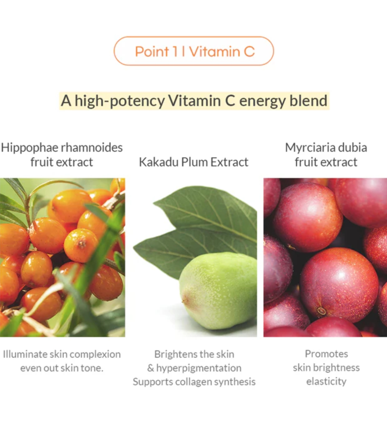 Aqua, Glycerin, Butylene Glycol, Niacinamide, Hippophae Rhamnoides (Sanddorn) Fruit Extract, Citrus Junos (Yuzu) Fruit Extract, Methyl Gluceth-20, Dipropylene Glycol, 1.2-Hexanediol, Polyglyceryl-10 Laurate, Hydroxyacetophenone, Diethoxyethyl Succinate, Arginin, Carbomer, Coptis Japonica Root Extract, Ethylhexylglycerin, Disodiumedta, Allantoin, Terminalia Ferdinandiana Fruit Extractt, Myrciaria Dubia (Camu Camu) Fruit Extract, Michelia Alba Flower Oil, Linalool