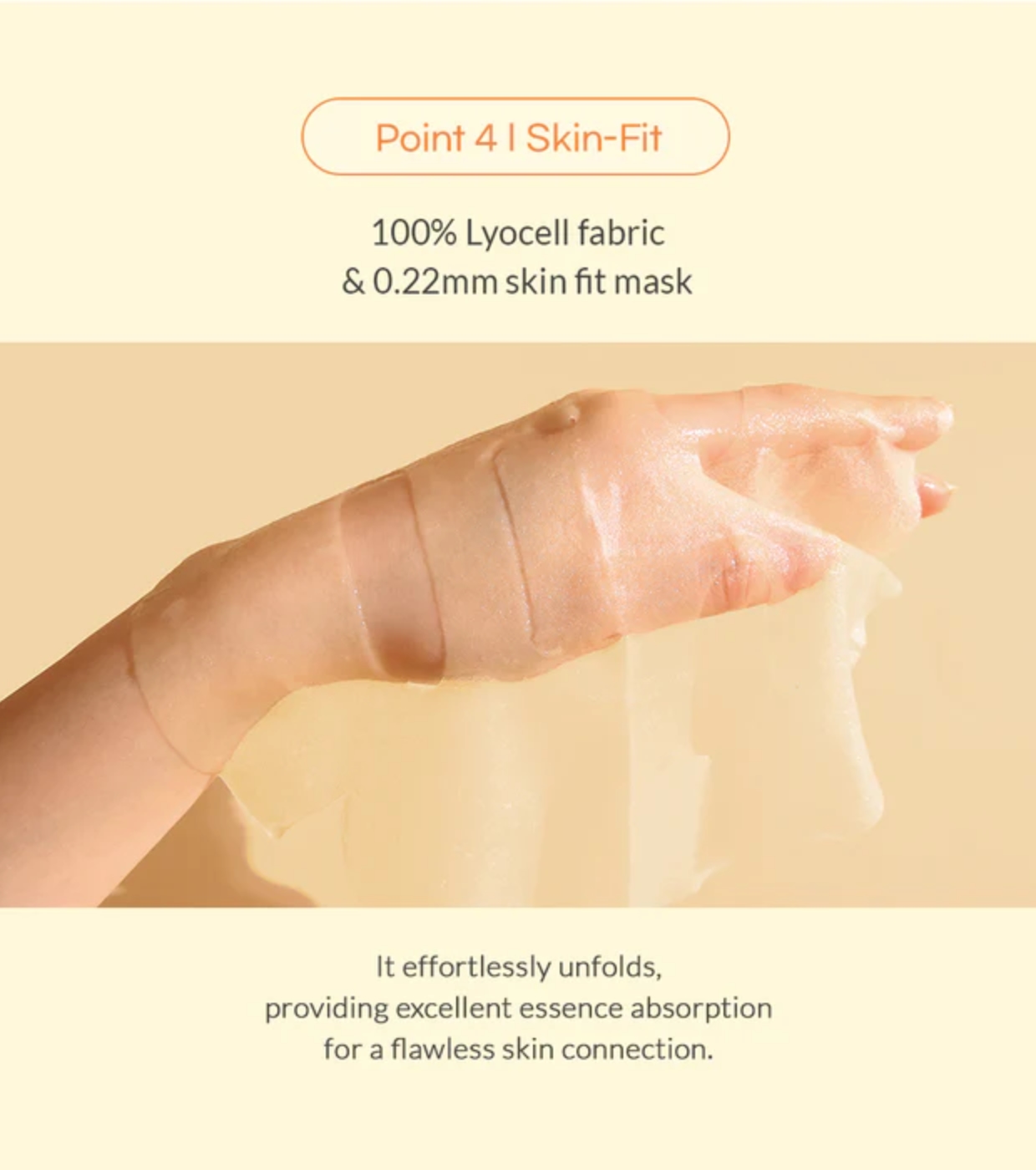 Sein 100 % Lyocell-Gewebe ist dünn, aber widerstandsfähig und passt sich perfekt dem Gesicht an, sodass die Essenz tief absorbiert wird.