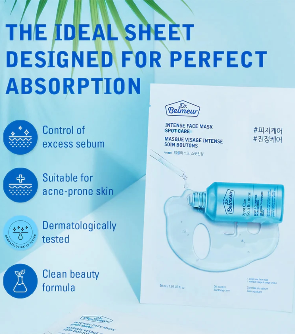 Die Spot Care Intense Face Mask von Dr. Belmeur ist eine intensiv pflegende Tuchmaske für fettige, gereizte oder unreine Haut.