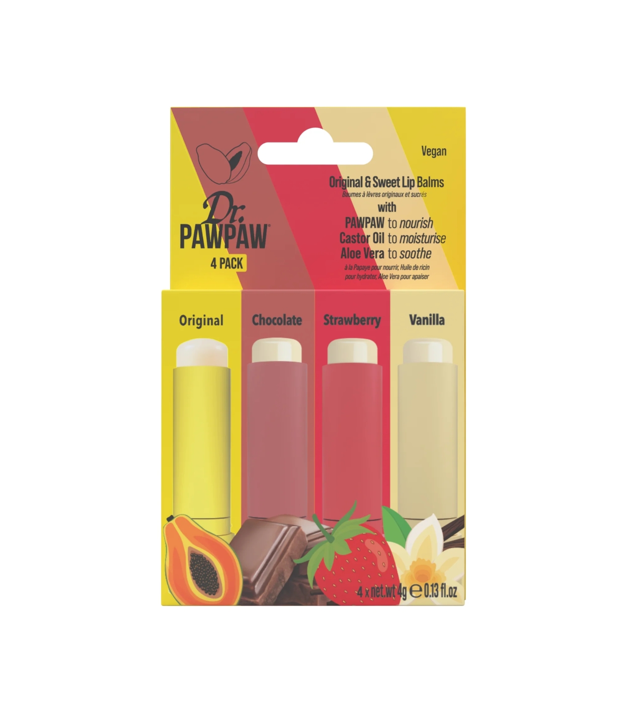 Dieses praktische Set enthält den Original Balm, einen 100 % natürlichen Klassiker, sowie drei 99 % natürliche Versionen mit unwiderstehlichen Geschmacksrichtungen: Erdbeere, Schokolade und Vanille.