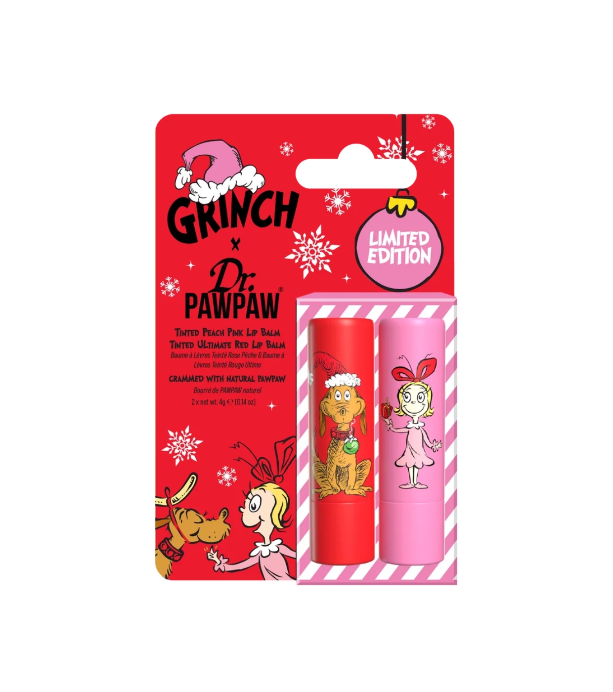 Whoville ist frecher denn je! Entdecke das Grinch x Dr.PAWPAW Tinted Duo, ein lustiges Duo aus getönten Lippenbalsamen, die deinen Lippen Feuchtigkeit spenden, sie weich machen und ihnen einen festlichen Farbtupfer verleihen.