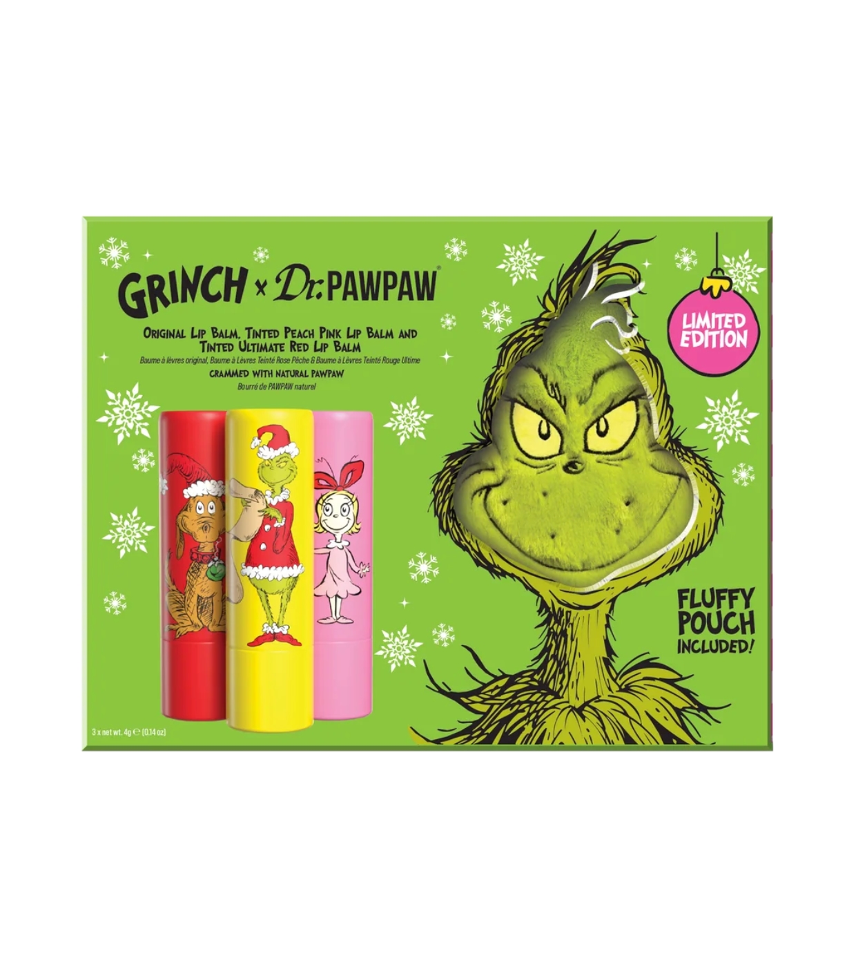 Direkt aus Whoville kommt das Grinch x Dr.PAWPAW Festive Trio , ein unverzichtbares Set, um Ihre Lippen während der gesamten Weihnachtszeit mit Feuchtigkeit zu versorgen, zu pflegen und ihnen Farbe zu verleihen.