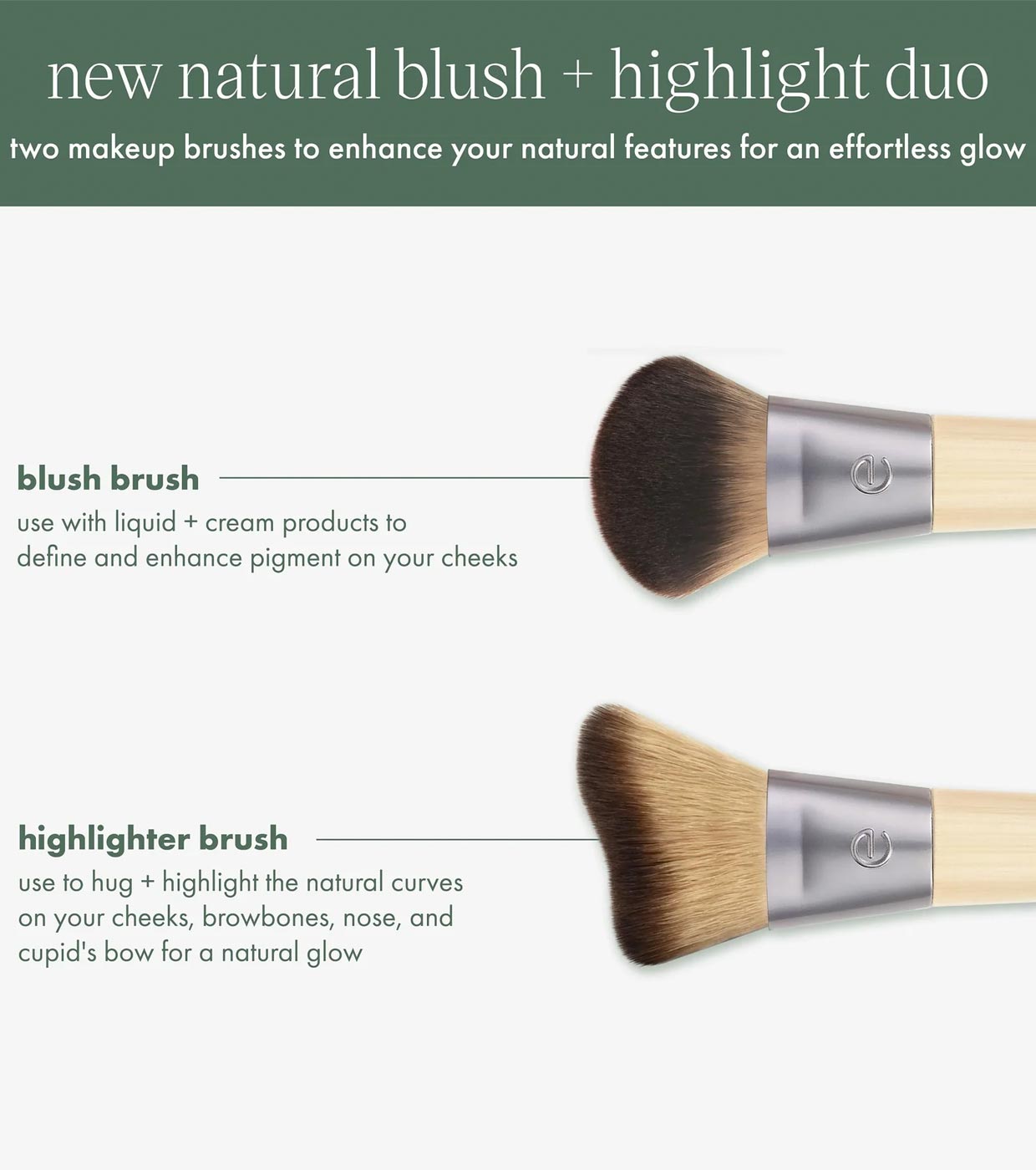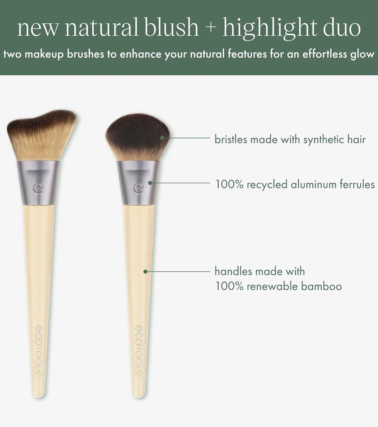 Das Duo EcoTools New Natural Blush + Highlight besteht aus einem Rougepinsel zum Auftragen von Pigmenten auf die Wangen und einem gebogenen Highlighterpinsel zur Betonung Ihrer natürlichen Gesichtszüge für einen mühelosen Glanz.