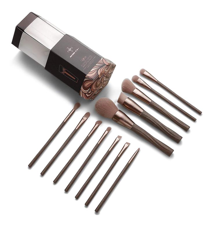 Mit Pinseln für Foundation, Concealer, Puder und Lidschatten.