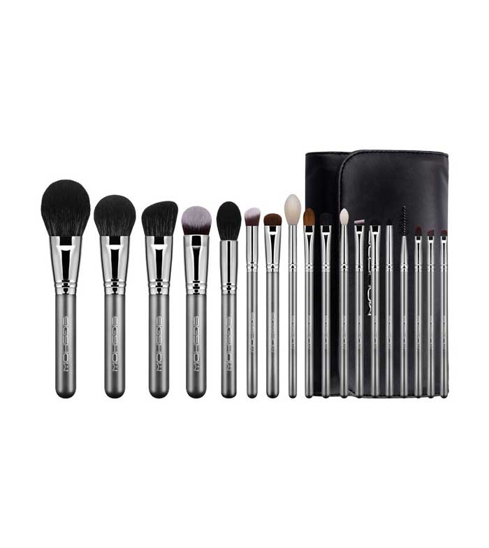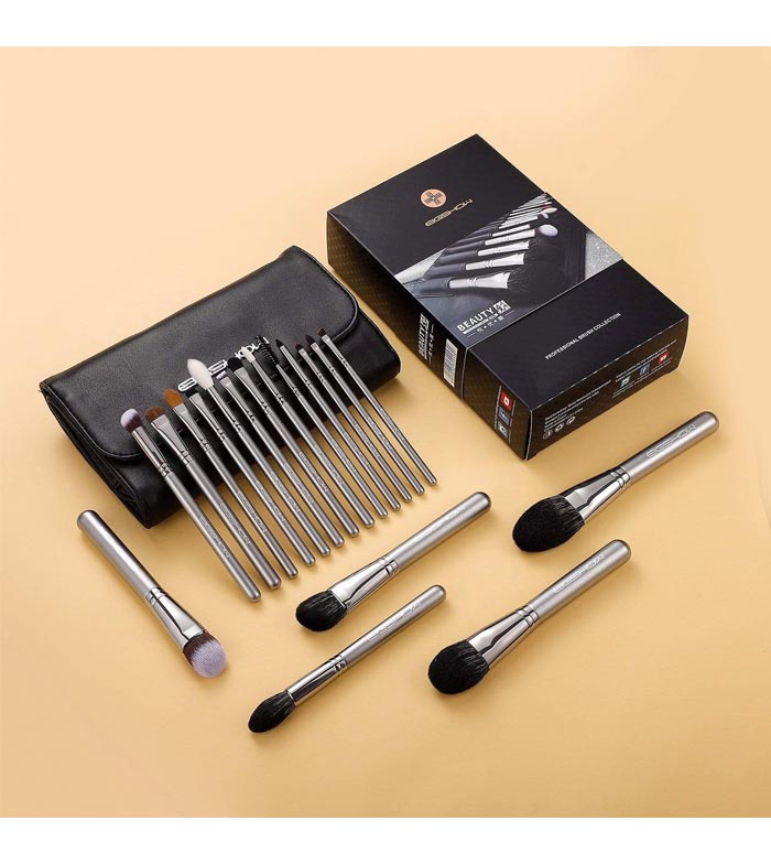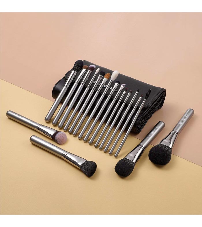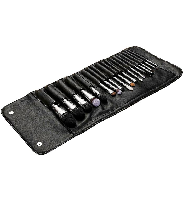 Mit Pinseln für Foundation, Concealer, Puder und Lidschatten.