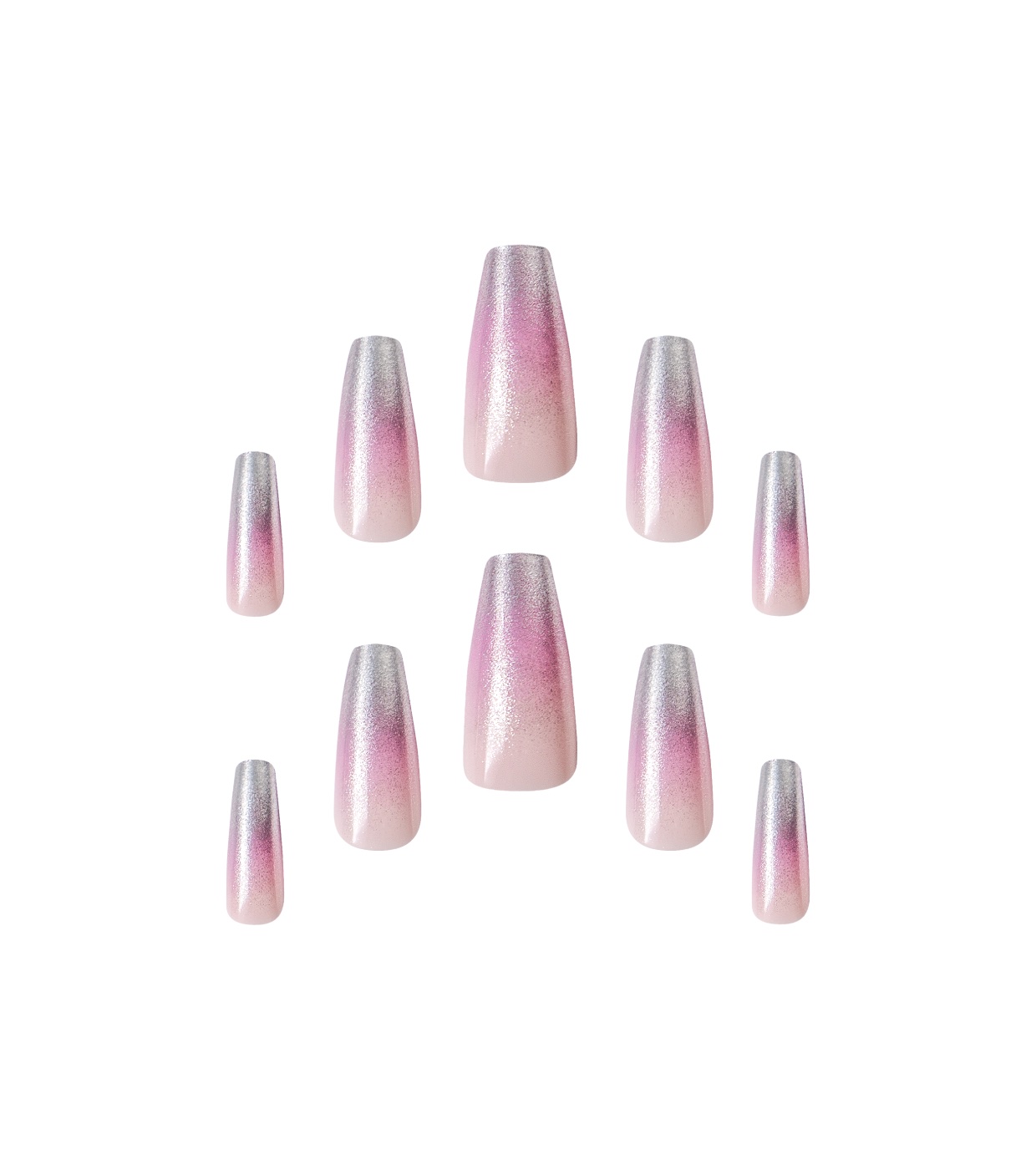 Mit einem wunderschönen Farbverlauf aus silbernem Chrom-Glitzer über einem Hauch von Flieder verleiht diese mehrfarbige Maniküre eine futuristische Atmosphäre, bereit für die Festivalsaison.