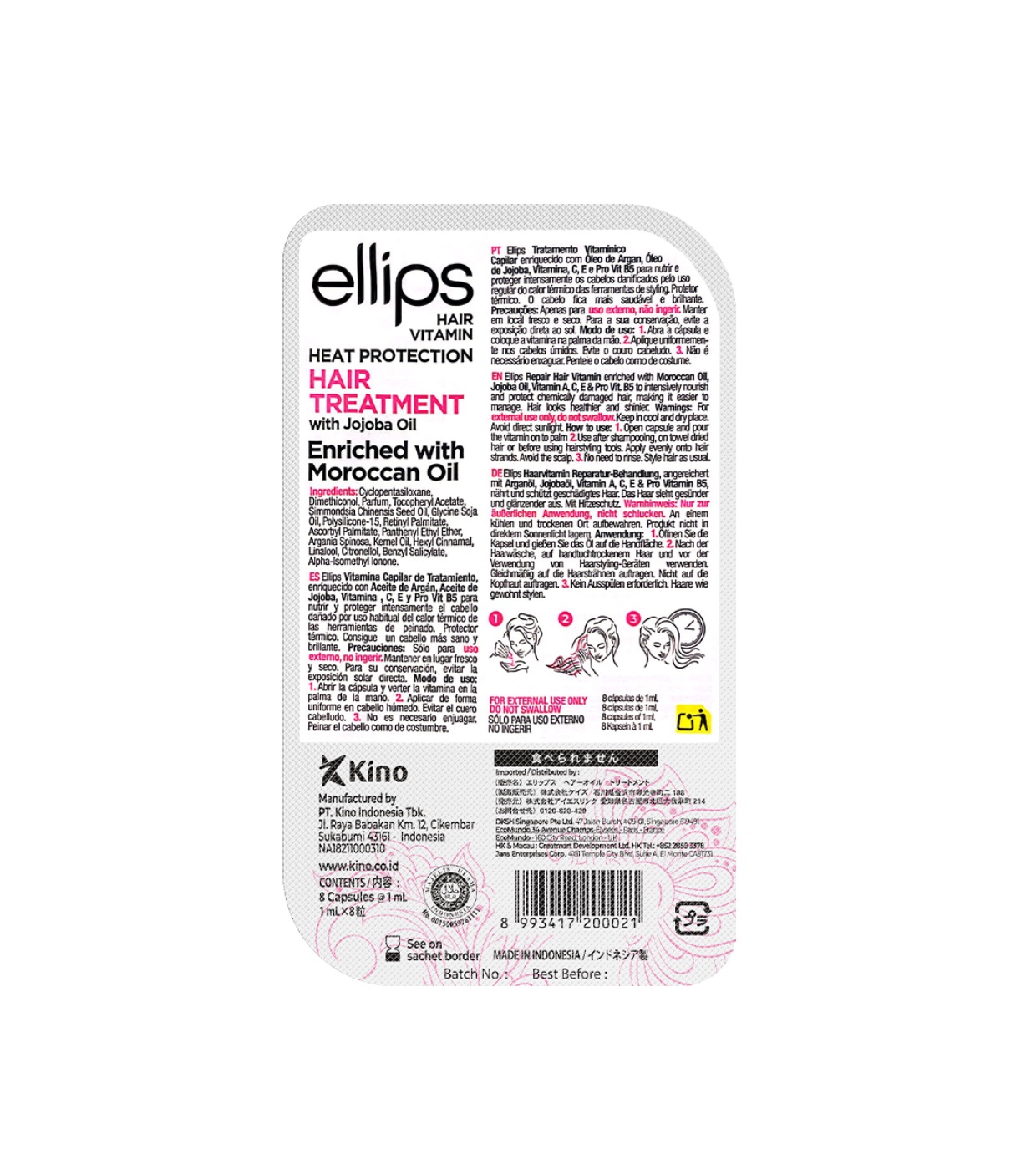 Diese Serumampullen sind mit Vitamin C, E und B5, Arganöl und Jojobaöl angereichert. um das Haar intensiv zu pflegen und zu schützen, das durch die regelmäßige Verwendung von Bügeleisen oder Wärmegeräten geschädigt wurde.