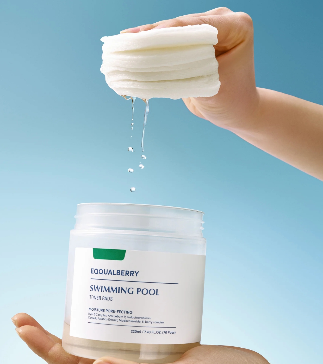 Verwandeln Sie Ihre Gesichtspflegeroutine mit Swimming Pool Toner Pads Swimming Pool Toner Pads , Multifunktionspads, die in einem Schritt Feuchtigkeit spenden, beruhigen und sanft peelen.