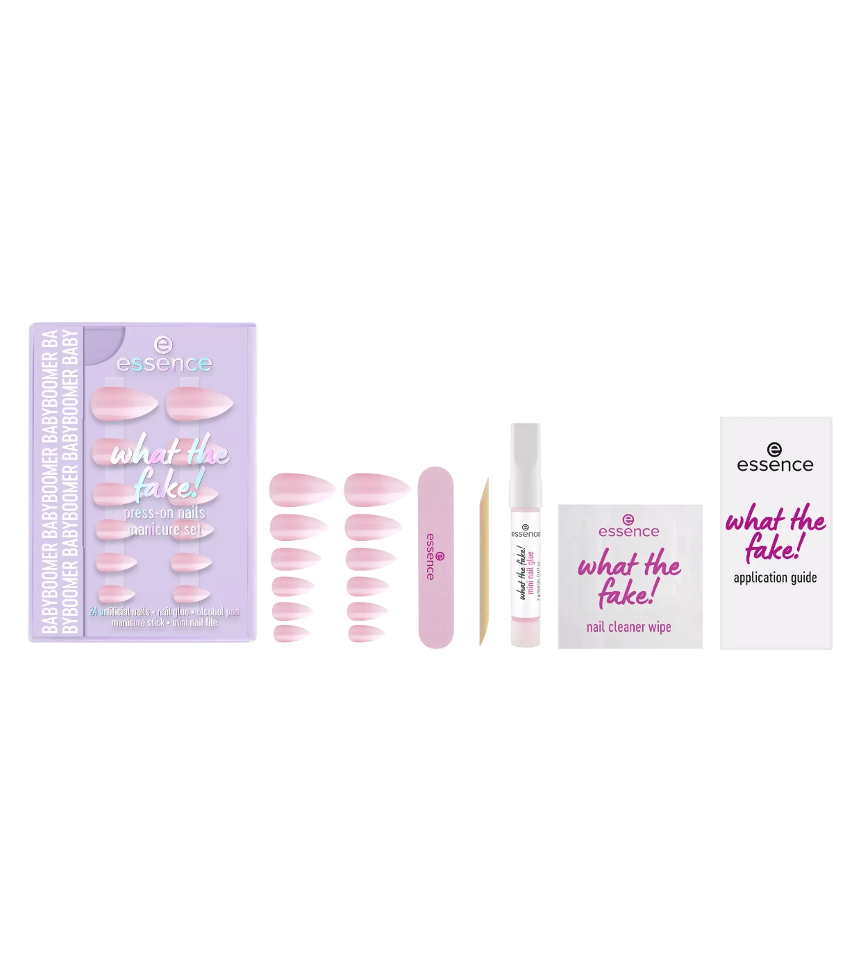 Das Set enthält außerdem Nagelkleber, einen Manikürestift, eine Mini-Nagelfeilen und ein Nagelreinigungstuch – alles Wichtige für eine glatte, langanhaltende Maniküre.