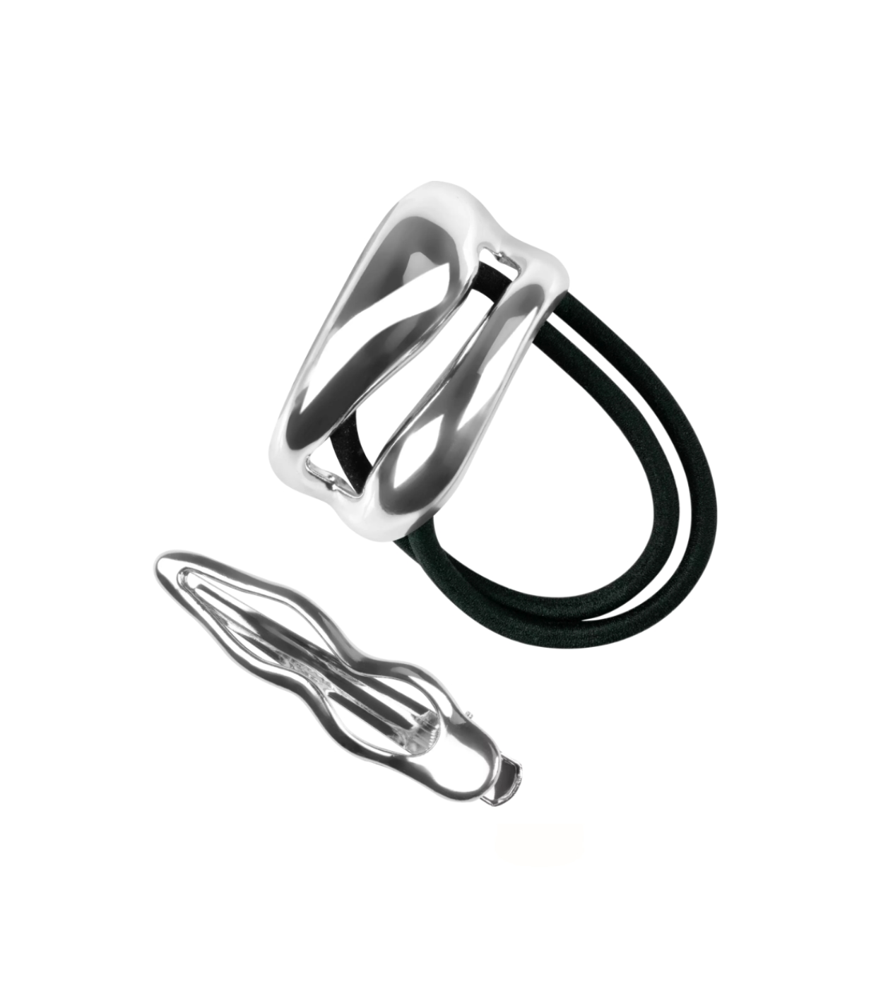 Das Set umfasst 2 Teile mit skulpturalem Chromdesign, ideal zum schnellen und einfachen Stylen von Pferdeschwänzen, Zöpfen oder losen Strähnen.