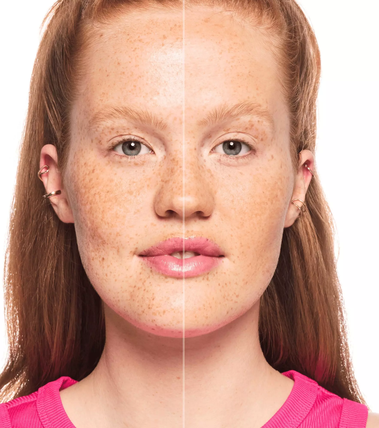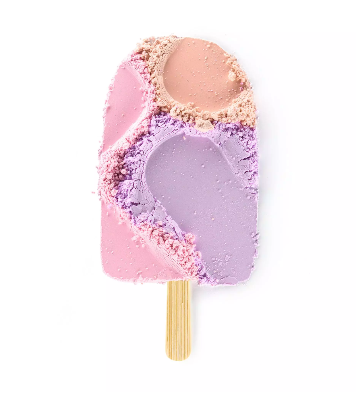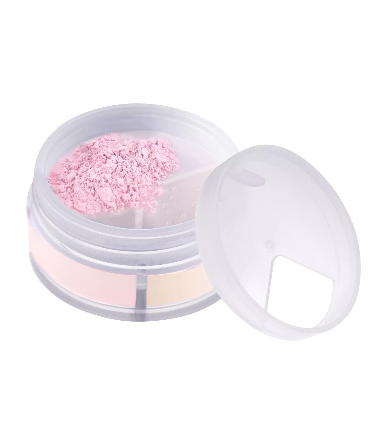 Die Flasche enthält drei verschiedene lose Puder für unterschiedliche Anwendungen: ein rosa und ein pfirsichfarbenes Puder zum Aufhellen der Augenkontur und ein lila Puder zur Korrektur gelber Untertöne.