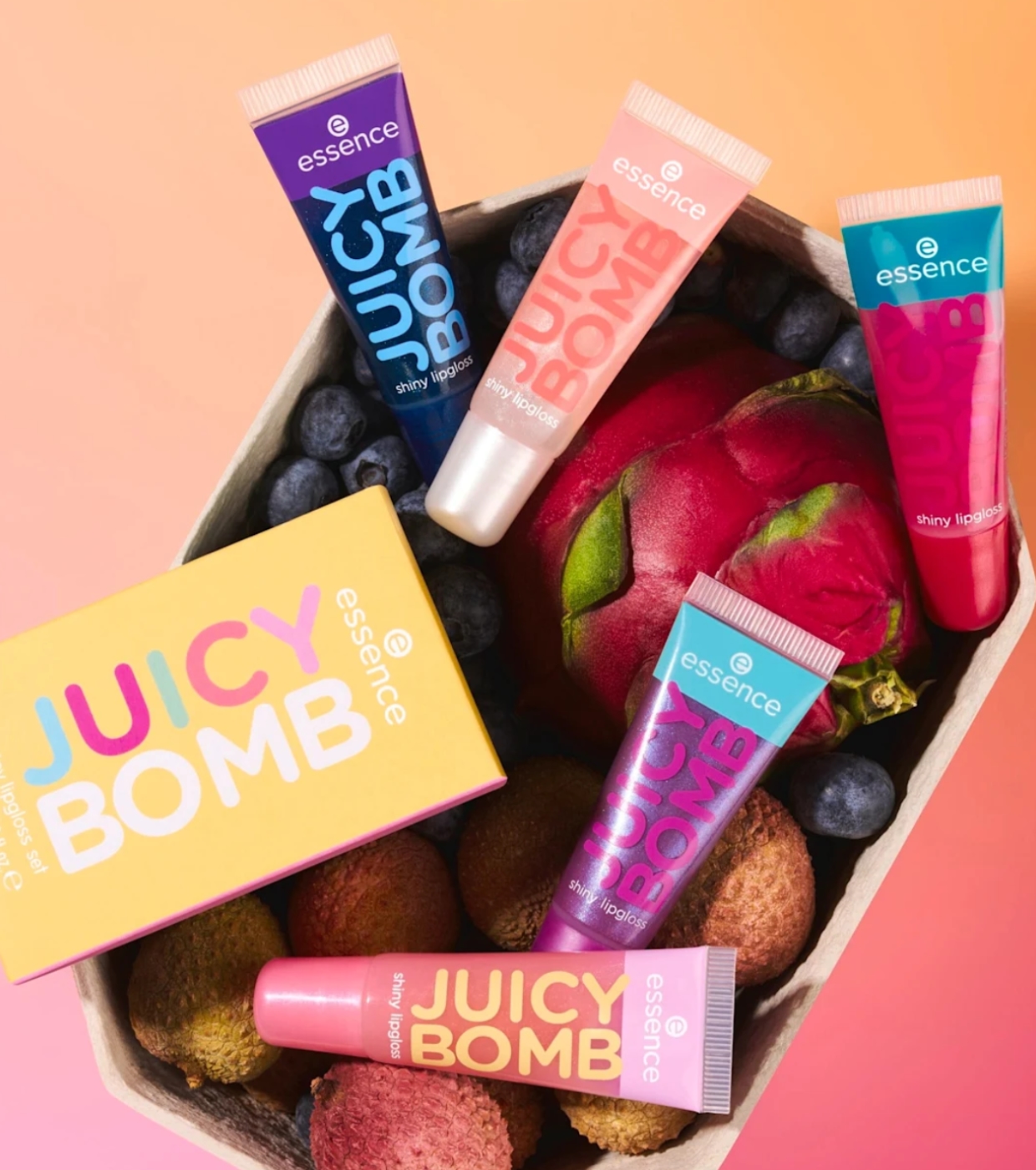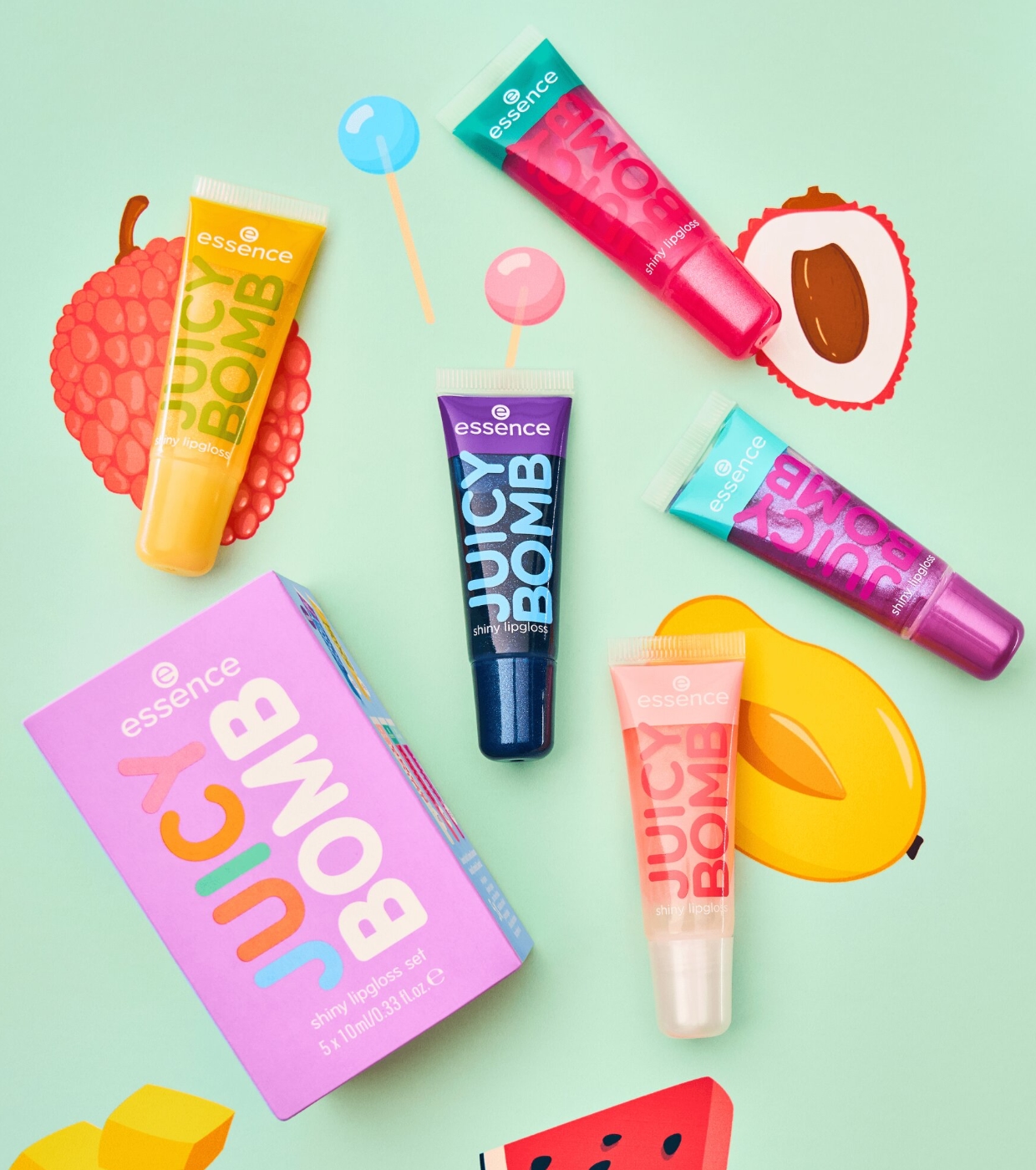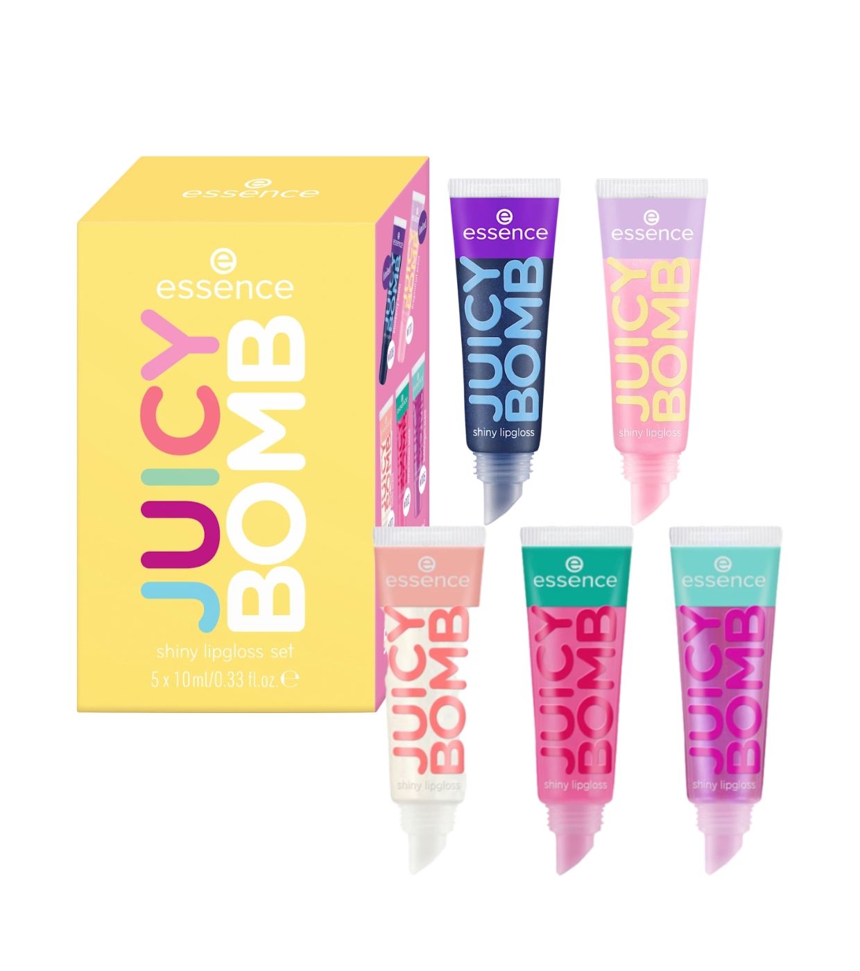Genießen Sie saftige, glänzende und duftende Lippen mit diesem unwiderstehlichen Lipgloss-Set von essence , das mehrere Farbtöne aus der legendären Juicy Bomb Kollektion enthält.