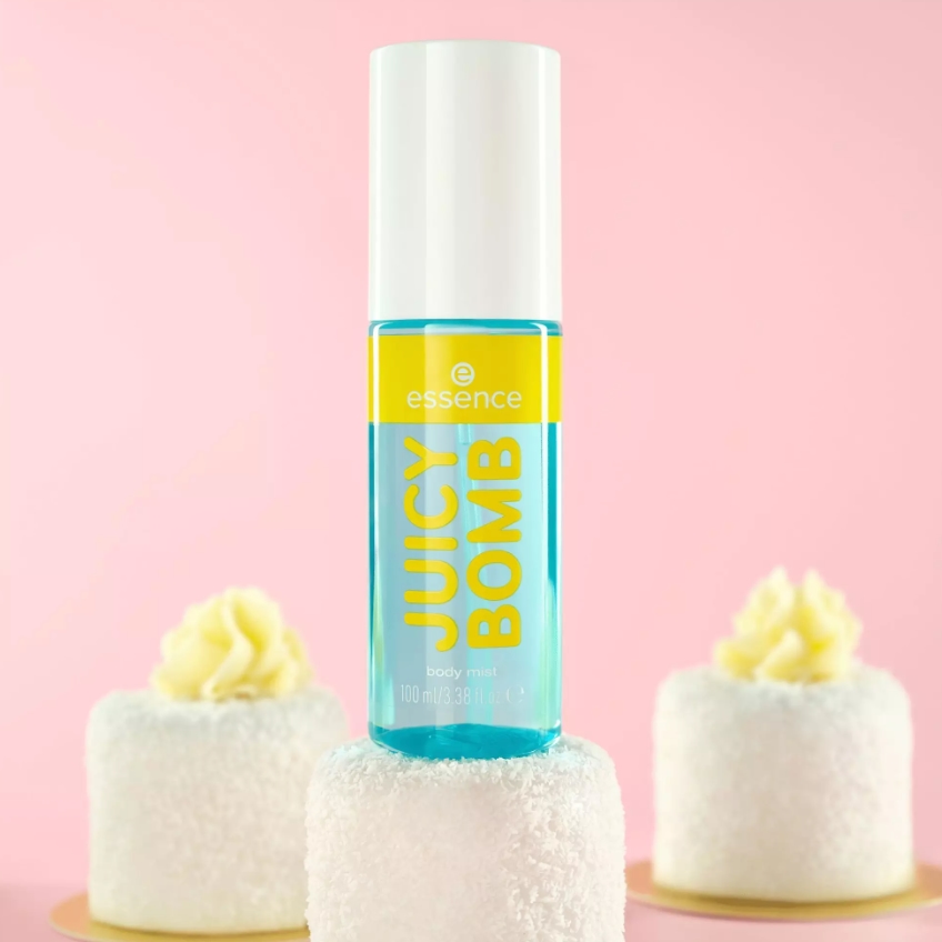 Verwöhne dich mit dem köstlichen Aroma deines Lieblings-Kokosnuss-Vanille-Kuchens mit dem JUICY BOMB 105 Coconut Chill Körperspray von essence .