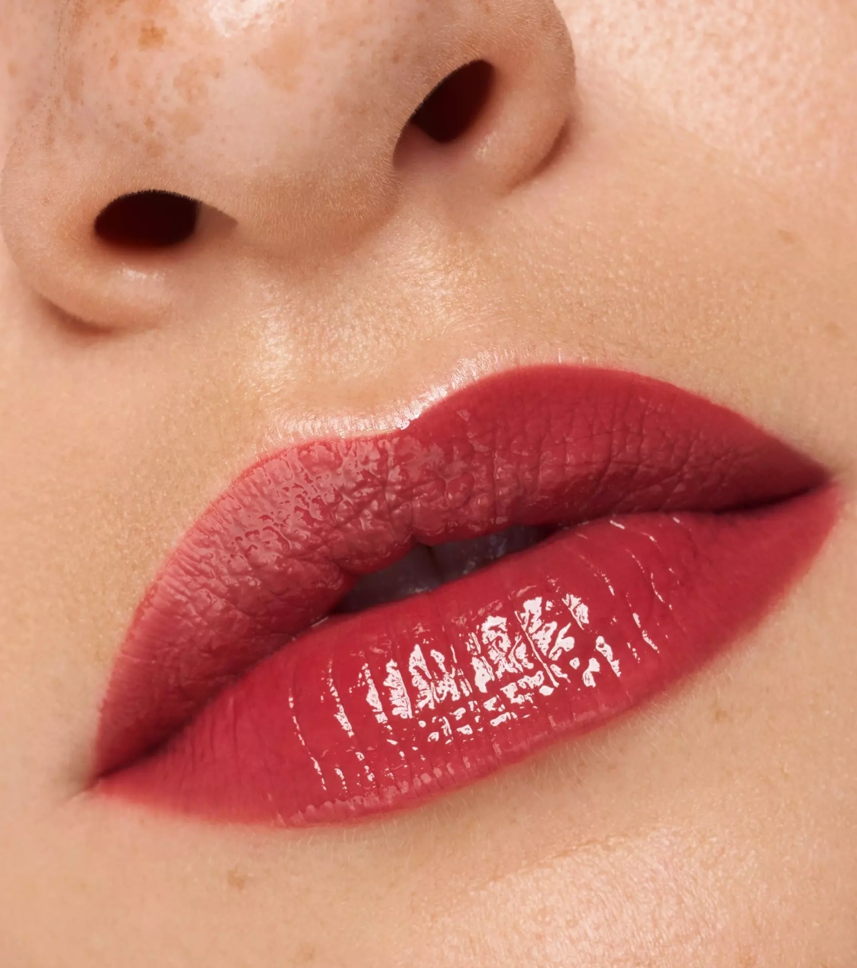 Wenn der Glanz verschwindet, hinterlässt die Textur einen dezenten Farbfleck, der auf den Lippen verbleibt und mit minimalem Aufwand für einen langanhaltenden Look sorgt.