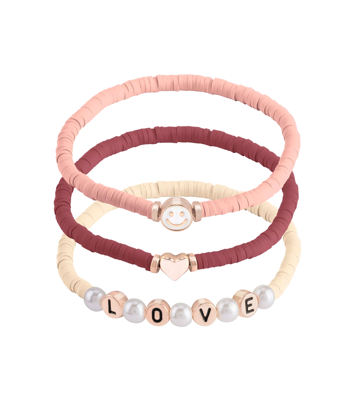 Dieses Set besteht aus drei flexiblen und bequemen Armbändern, die mit bezaubernden Anhängern in Roségoldtönen verziert sind, die Niedlichkeit und Stil widerspiegeln.