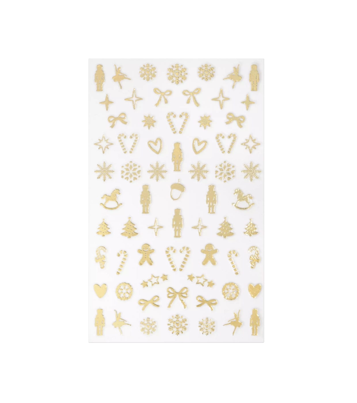 Dieses Set enthält 66 goldene Aufkleber mit bezaubernden Motiven: Schneeflocken, Sterne, Zuckerstangen, Ballerinen, Nussknacker und andere Weihnachtsmotive, die für ein süßes und glänzendes Finish sorgen.