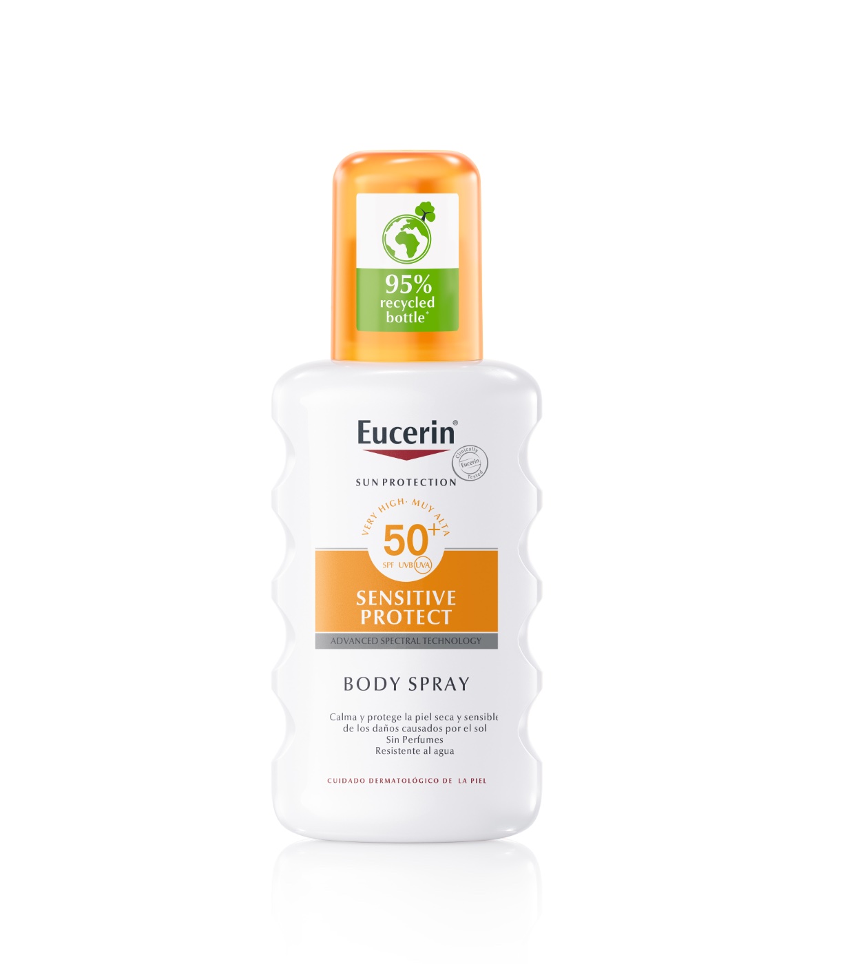 Eucerin Sun Spray Sensitive Protect FPS 50+ ist ein Sonnenschutzspray für den Körper, das empfindliche Haut beruhigt und schützt.