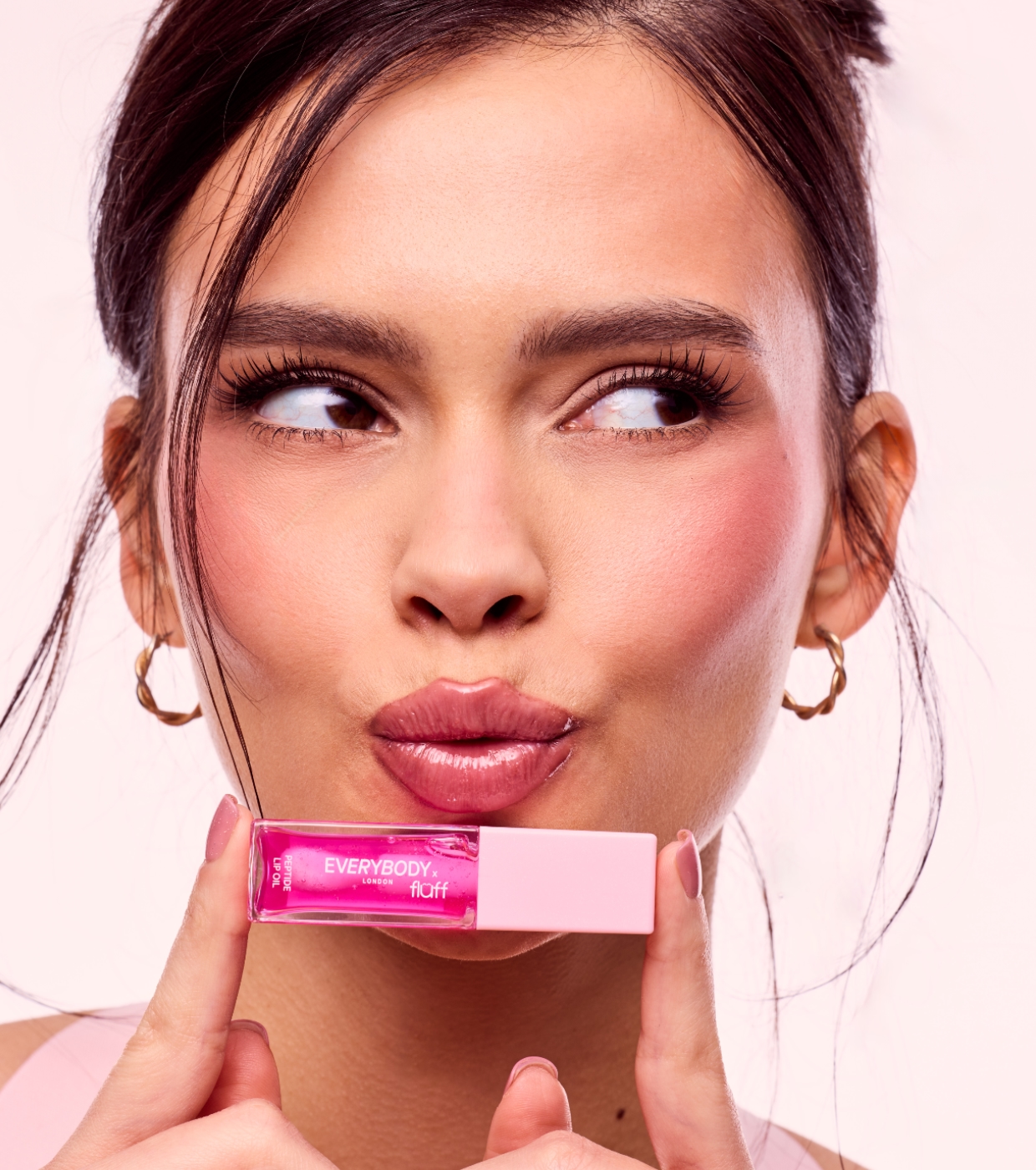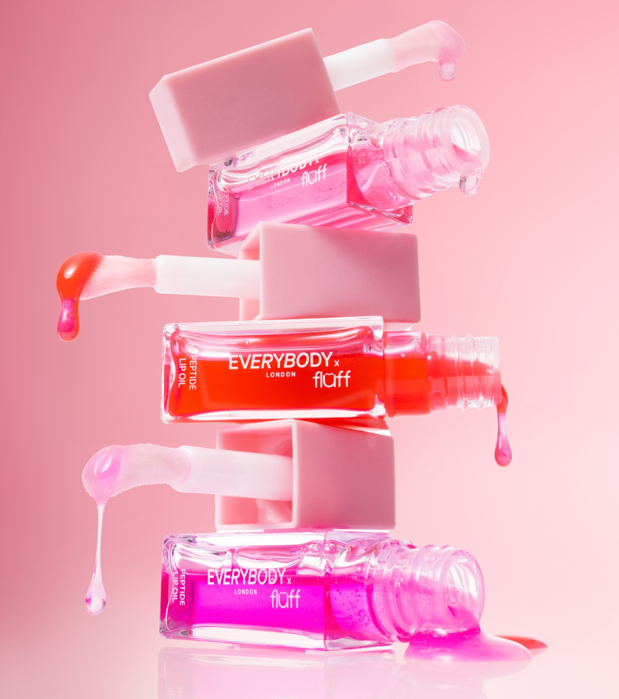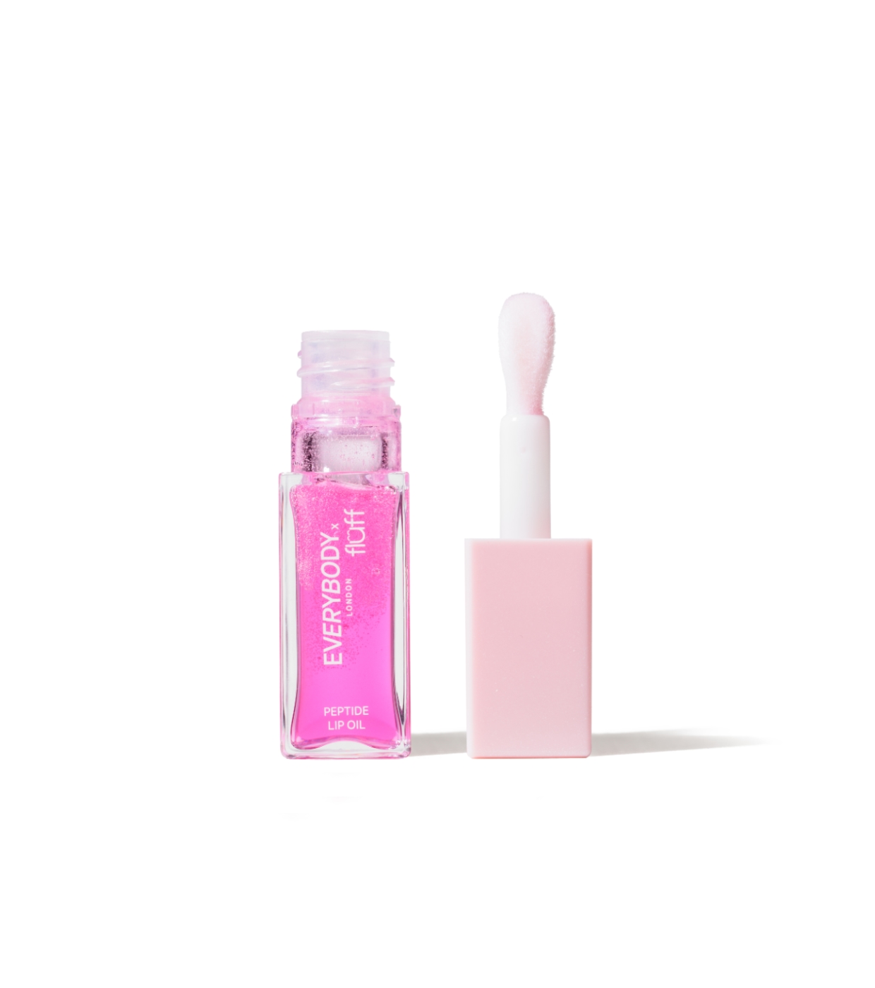 Entdecken Sie das Peptid-Lippenöl aus der Everybody London x Fluff-Kollaboration , präsentiert in einem wunderschönen transparenten Behälter mit rosa Design.