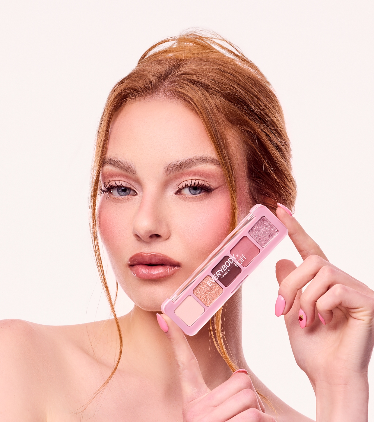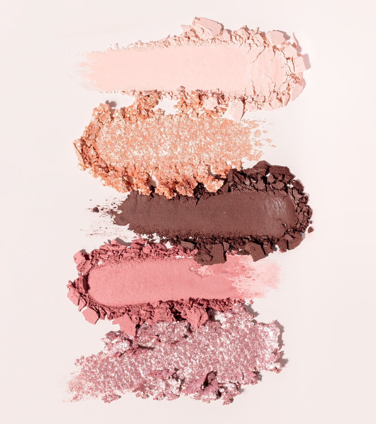 Die Palette umfasst fünf rosafarbene und neutrale Farbtöne mit mattem und glänzendem Finish, ideal für die Kreation sanfter und romantischer Looks.