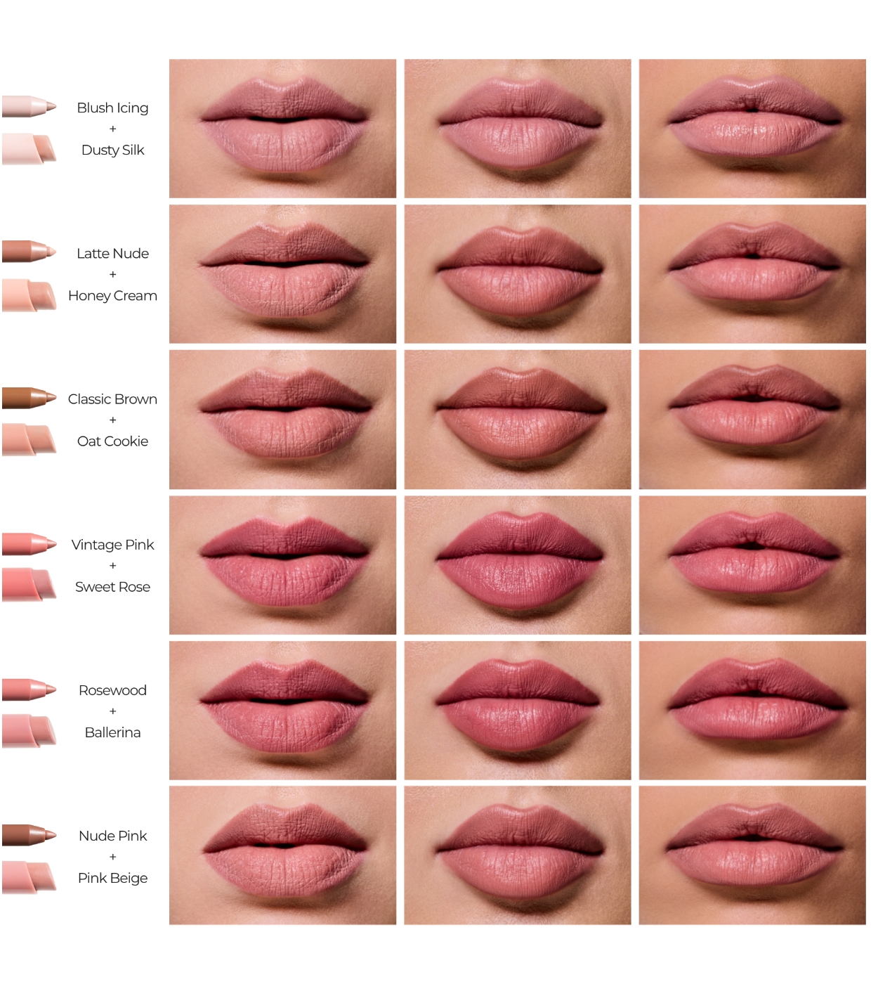 Perfekt für die alleinige Verwendung, um die Lippen mit einem matten Finish vollständig auszufüllen, oder als Basis für Ihren Lieblingslippenstift oder -fleck, um den Halt und die Intensität der Farbe zu verbessern.
