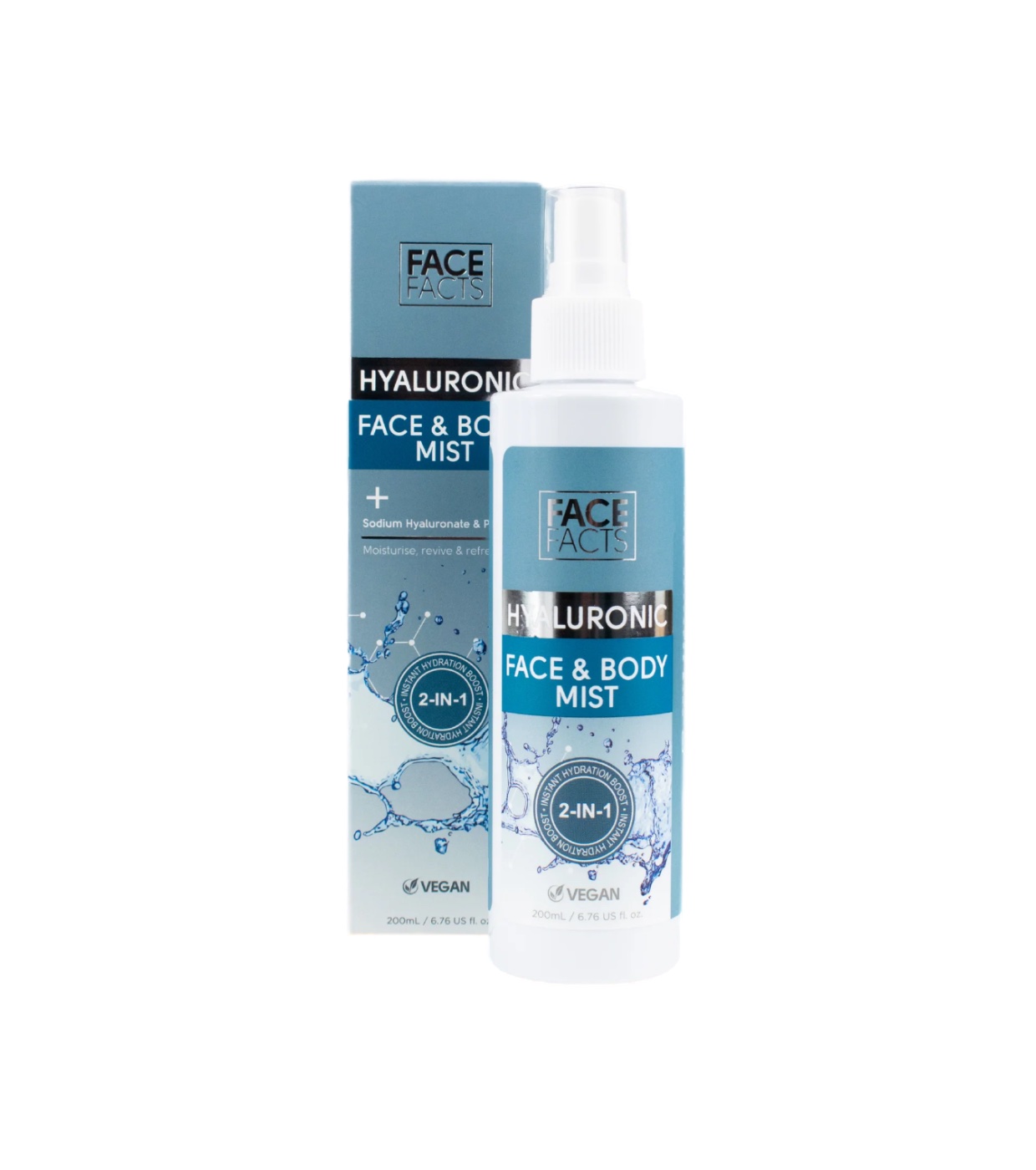 Revitalisieren und erfrischen Sie stumpfe, dehydrierte Haut mit dem Face Facts Hyaluronic Face and Body Mist .